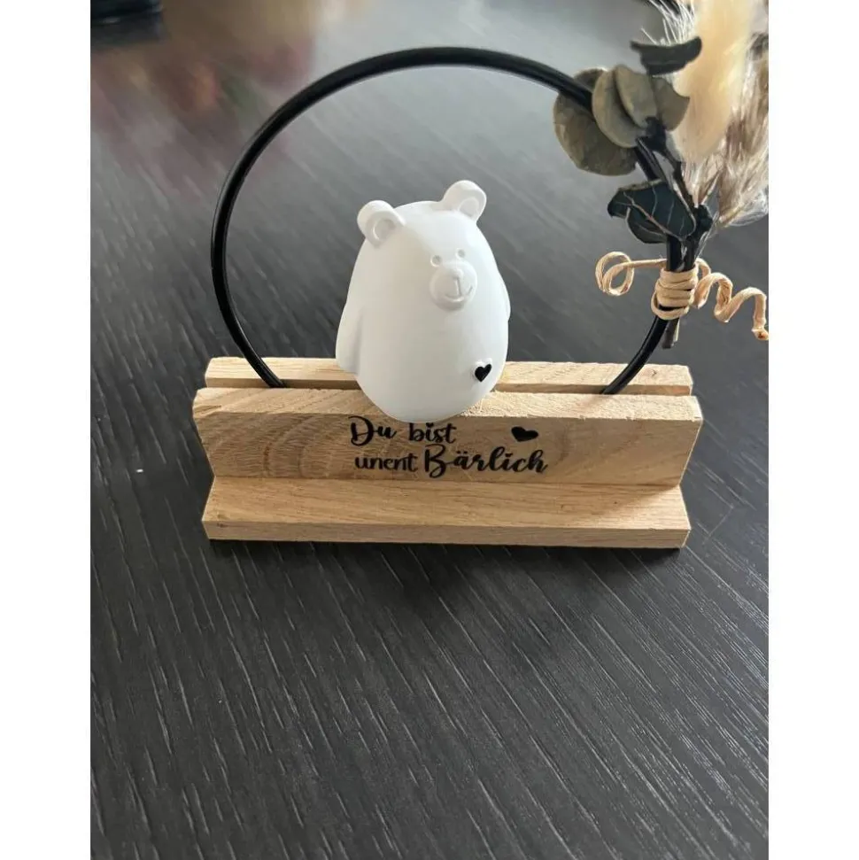 Der Aufsteller besteht aus einem Holzklötzchen-Ständer in dem ein kleiner schwarzer Metallring befestigt ist. An dem Metallring befindet sich ein kleines Trockenblumensträußchen Auf dem Holzständer sitzt ein kleines Bärchen. Vorn auf dem Aufsteller ist ein süßer Schriftzug.