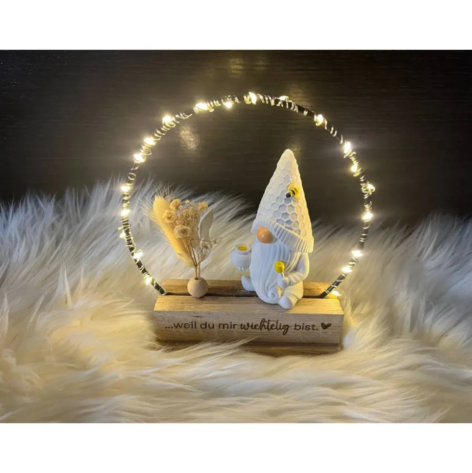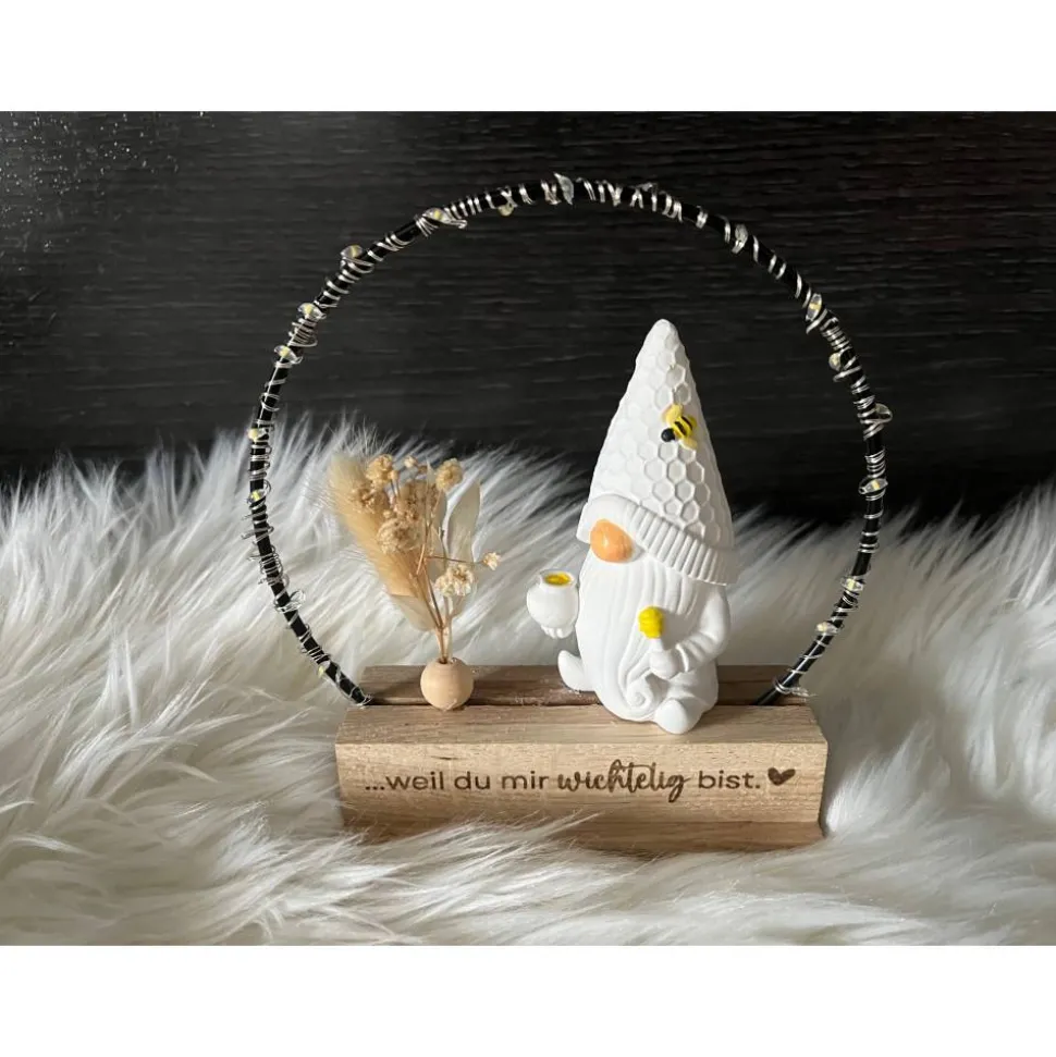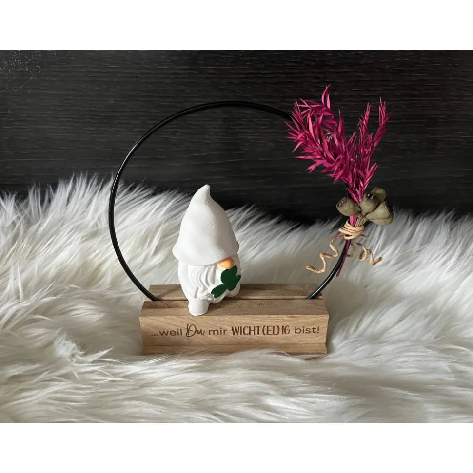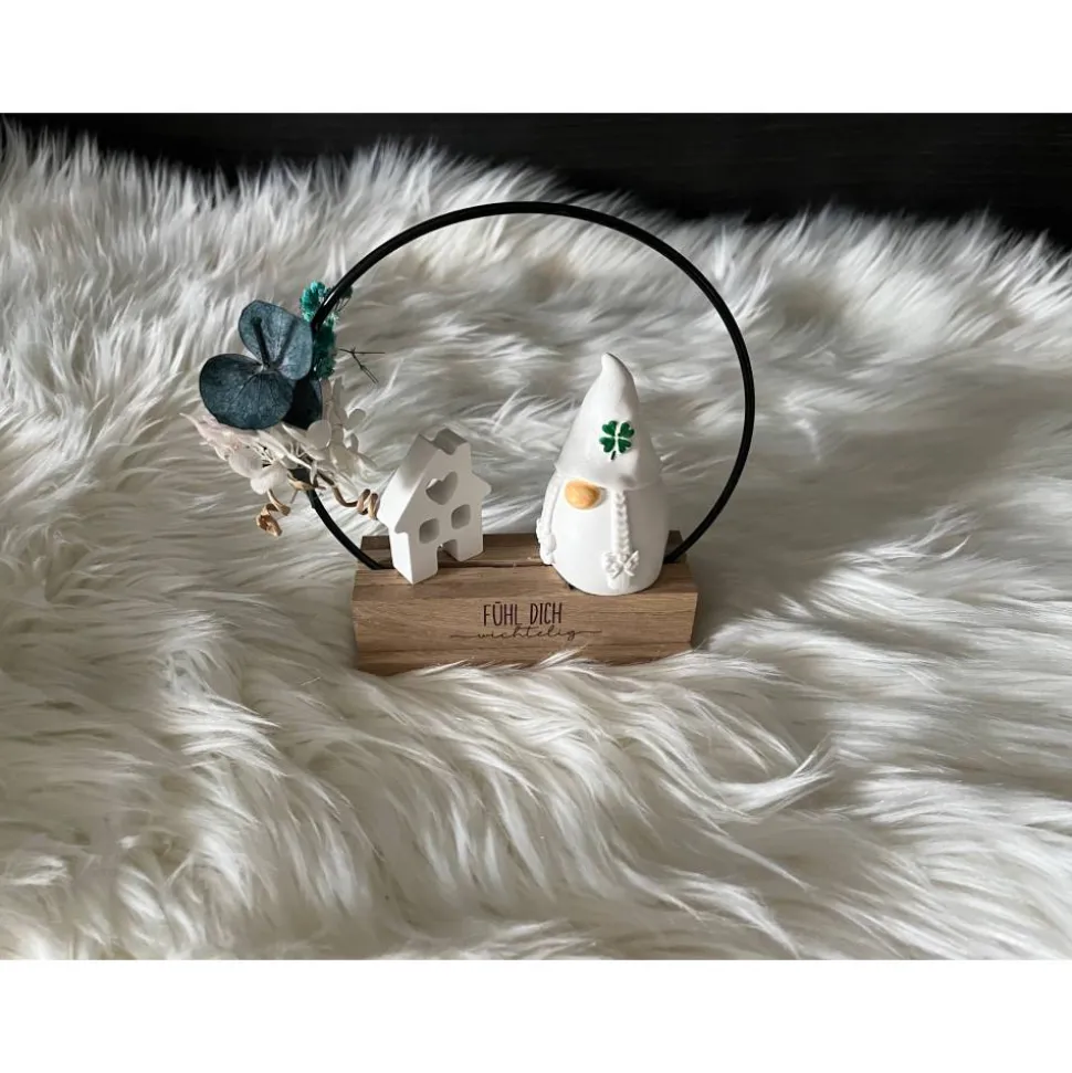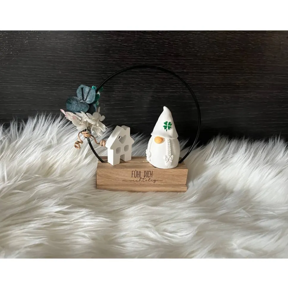 Der Aufsteller besteht aus einem Holzklötzchen-Ständer in dem ein schwarzer Metallring befestigt ist. An dem Metallring befindet sich ein kleines Trockenblumensträußchen oder alternativ, gegen Aufpreis, eine LED-Licherkette. Auf dem Holzständer sitzt ein Wichtel und wenn gewünscht kann man den Aufsteller auch mit einem zusätzlichen weißen Häuschen erwerben. Vorn auf dem Aufsteller ist ein gravierter Schriftzug.