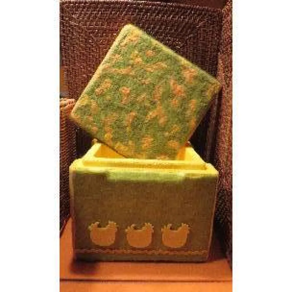 Zusätzlich sorgen Filzborte, Zackenlitze und gezielt eingesetzte Acrylfarben für ein frisches, österliches Design. Die Farben der Box sind Grün und Gelb in verschiedenen Farbstufen. Die Außenmaße betragen ca. 22 x 22 x 18 cm, die Innenmaße ca. 16,5 x 16,5 x 14 cm. Die Innenflächen und der Außenboden wurden sorgfältig mit Acrylfarbe gestrichen.