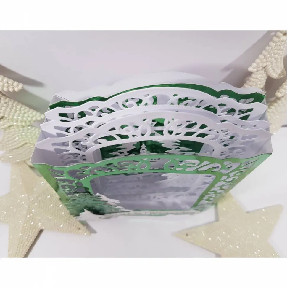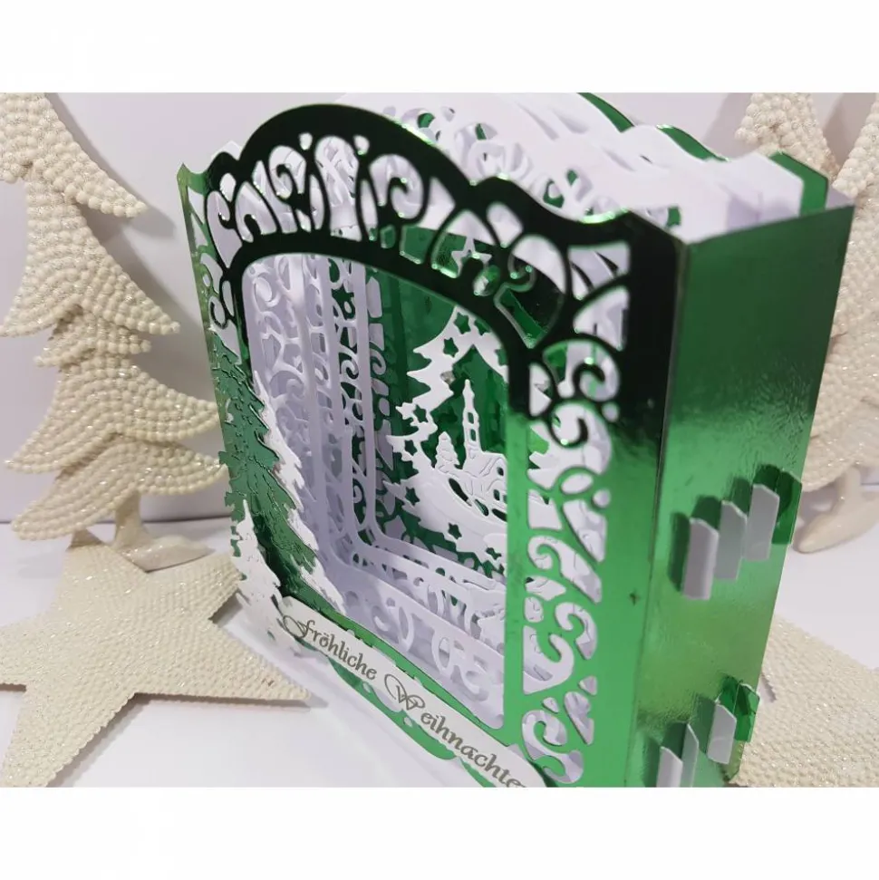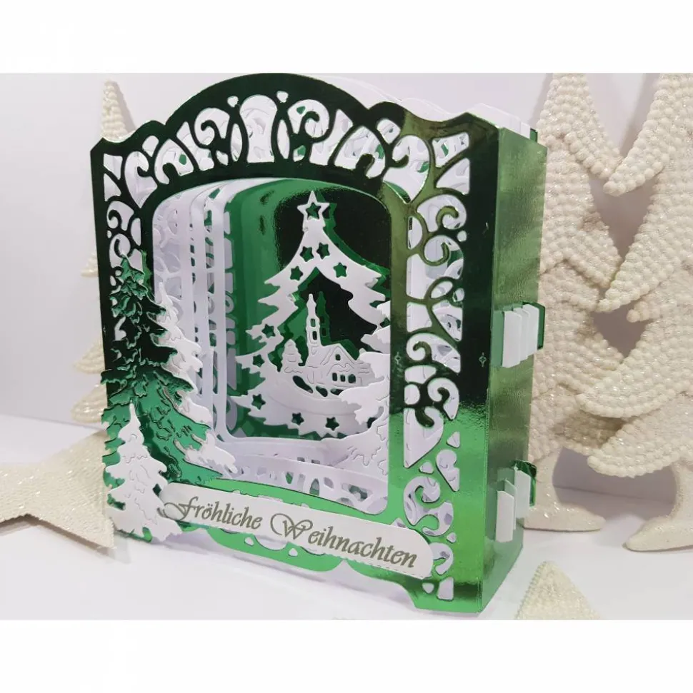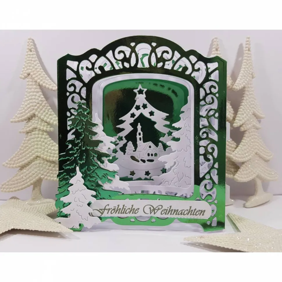 Diese dreidimensionale Karte ist sehr verspielt, aber auch festlich elegant n ihrem strahlendem Weiß und glänzendem Tannengrün.