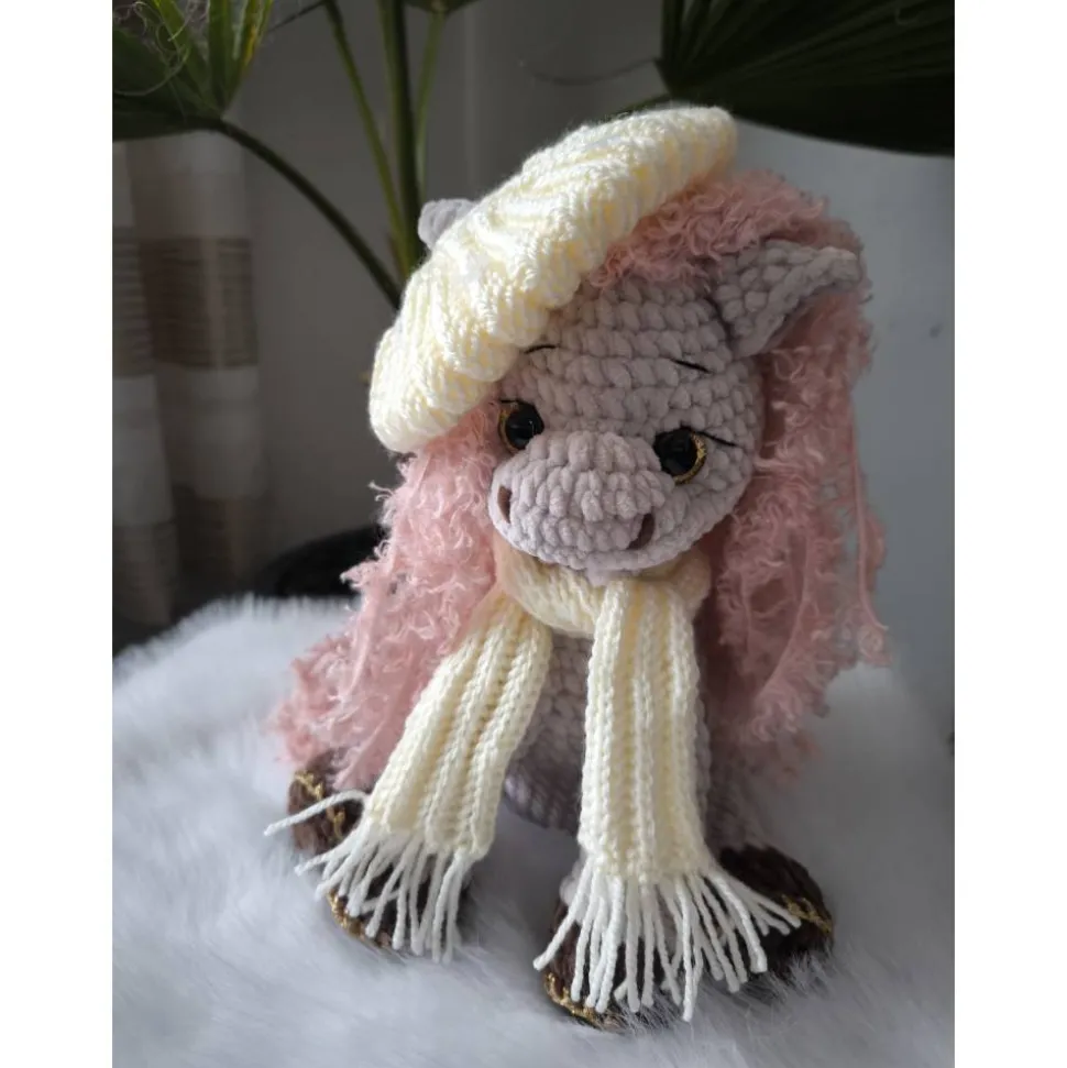 Aurora ist ein zartes, handgehäkeltes Pferdchen aus weicher Chenille-Wolle, etwa 28 cm groß und voller winterlicher Magie. Mit ihrer rosa Mähne und den abnehmbaren Accessoires wirkt sie, als käme sie direkt aus einer Weihnachtsgeschichte.
