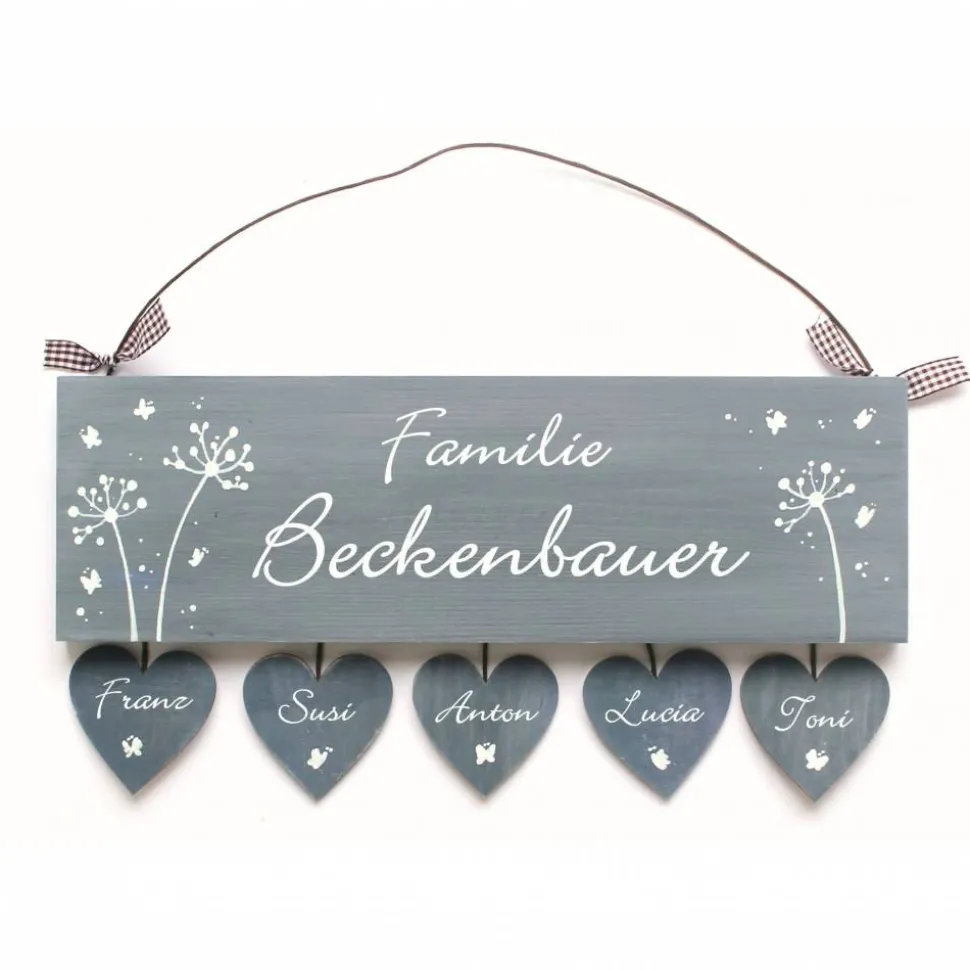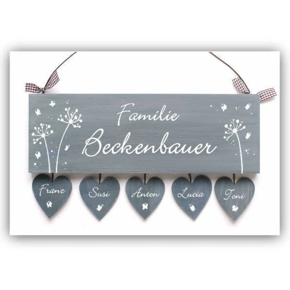 Jedes Haustürschild wird handgemacht und mit viel Liebe zum Detail gefertigt. Das Familien-Holzschild ist handbemalt mit hochwertigen Farben und begeistert durch sein einmaliges Willkommens-Design. Originelle Pusteblumen und filigrane Schmetterlinge zieren das Schild, das in der Mitte zweizeilig mit „Familie“ und deinem Nachnamen in Wunschschriftart beschriftet wird. Bis zu 6 Herzanhänger aus Holz können individuell mit Vornamen versehen werden – jeder Anhänger wird mit einem aufgemalten Schmetterling verziert.