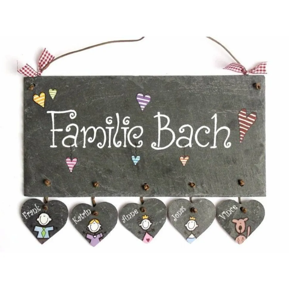 Verleihe deinem Eingangsbereich eine besondere Note mit unserem hochwertigen Türschild aus Schiefer, das individuell mit deinem Familiennamen personalisiert wird. Jedes Schild ist ein handgefertigtes Unikat – exklusiv für dich gestaltet und bemalt.