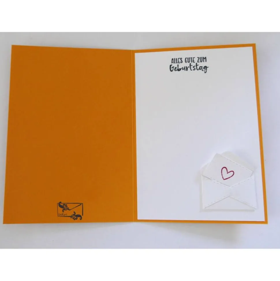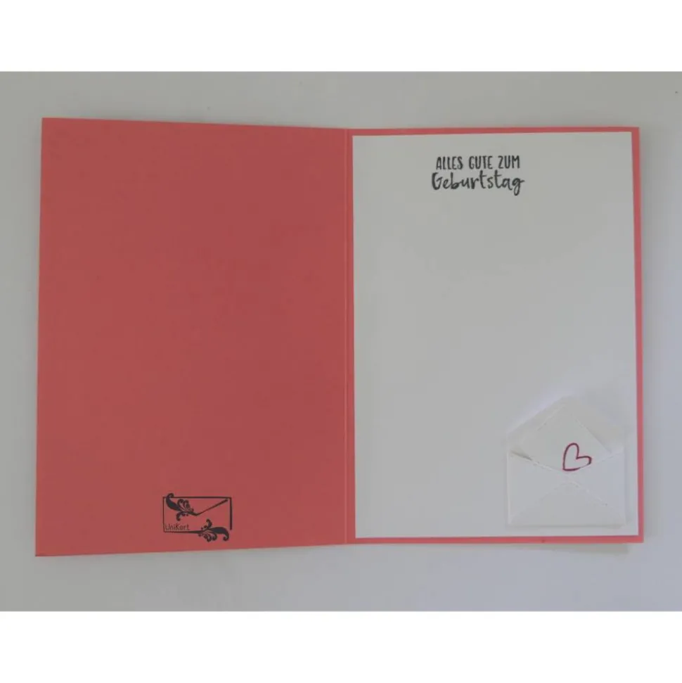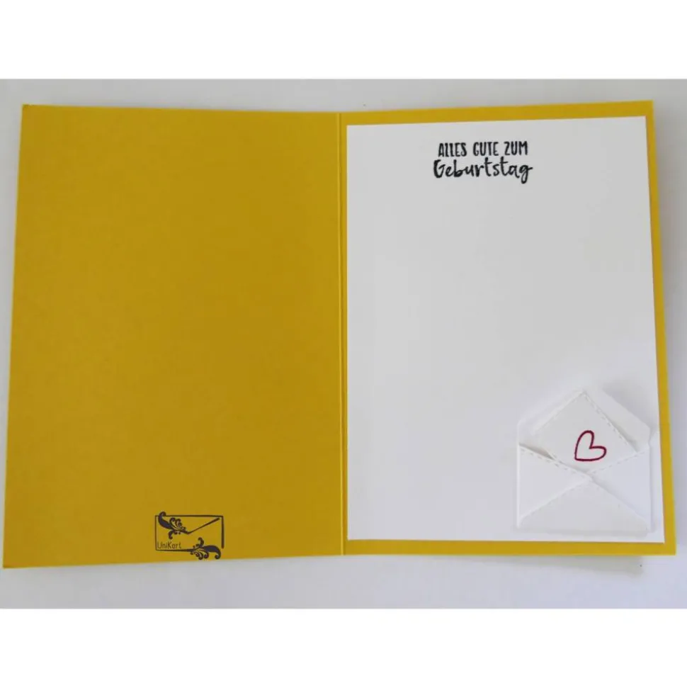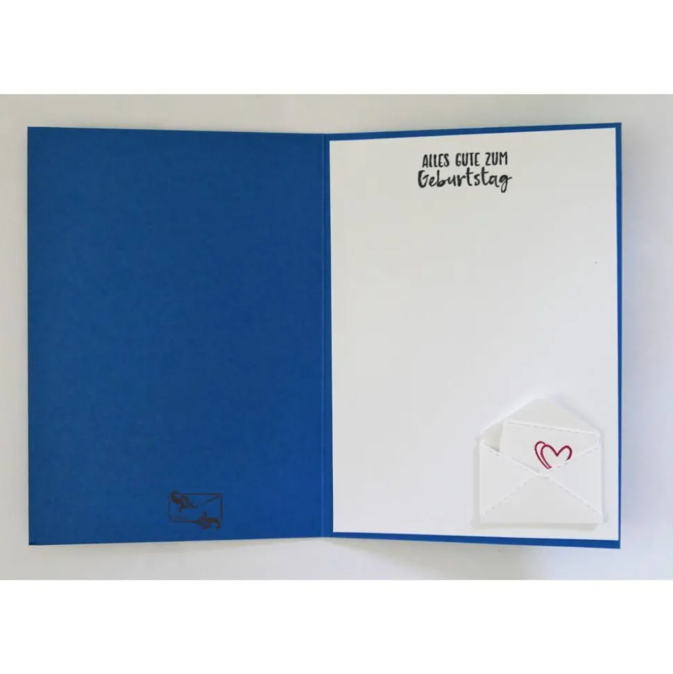 Im Inlett ist ein Stempelspruch „Alles Gute zum Geburtstag“ aufgestempelt. Ein Briefumschlag im Inlett enthält einen Brief mit einer Botschaft.