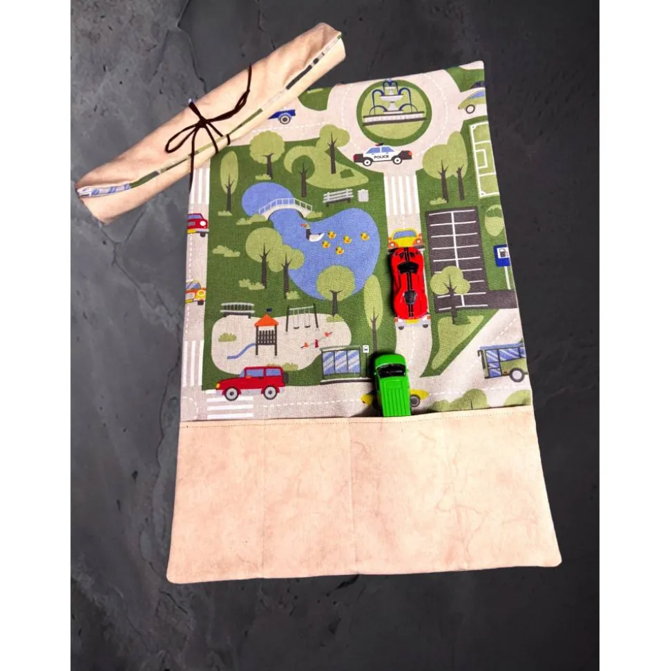 Diese liebevoll genähte Auto-Spielmatte ist der perfekte Begleiter für kleine Auto-Fans – egal ob im Restaurant, im Wartezimmer, im Urlaub oder einfach zuhause.