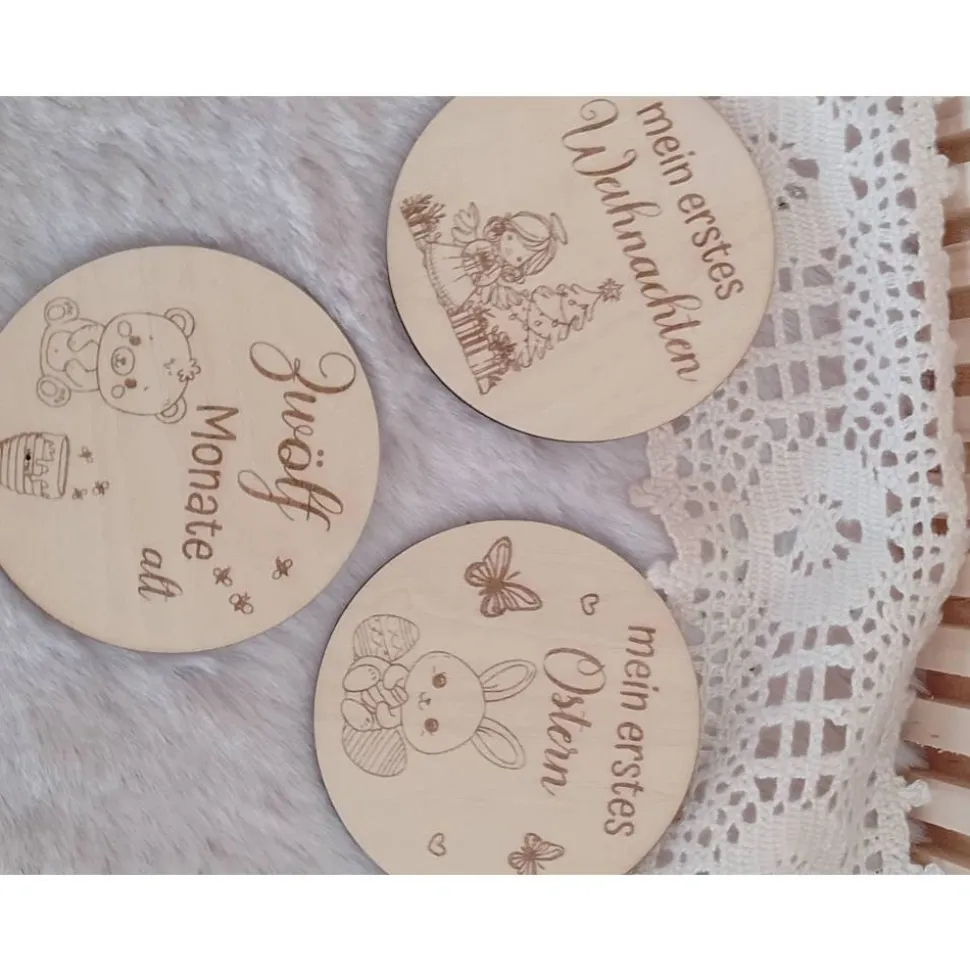 Das Set beinhaltet 15 runde Holz-Kreise, verpackt in einem Baumwollbeutel und mit dem Namen( wenn gewünscht) versehen.
