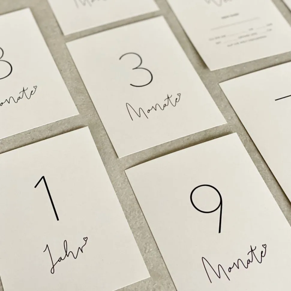 Man legt einfach die jeweilig passende Karte neben das Baby und fotografiert. Somit kann man schnell und unkompliziert wichtige Abschnitte der Entwicklung dokumentieren, um diese z. B. in ein Album zu kleben, an die Wand zu hängen oder auch digital zu verschicken. Der Kreativität sind hier keine Grenzen gesetzt. Die Rückseite der Karten ist unbedruckt, so dass man genügend Platz für persönliche Notizen hat (z.B. Datum).
