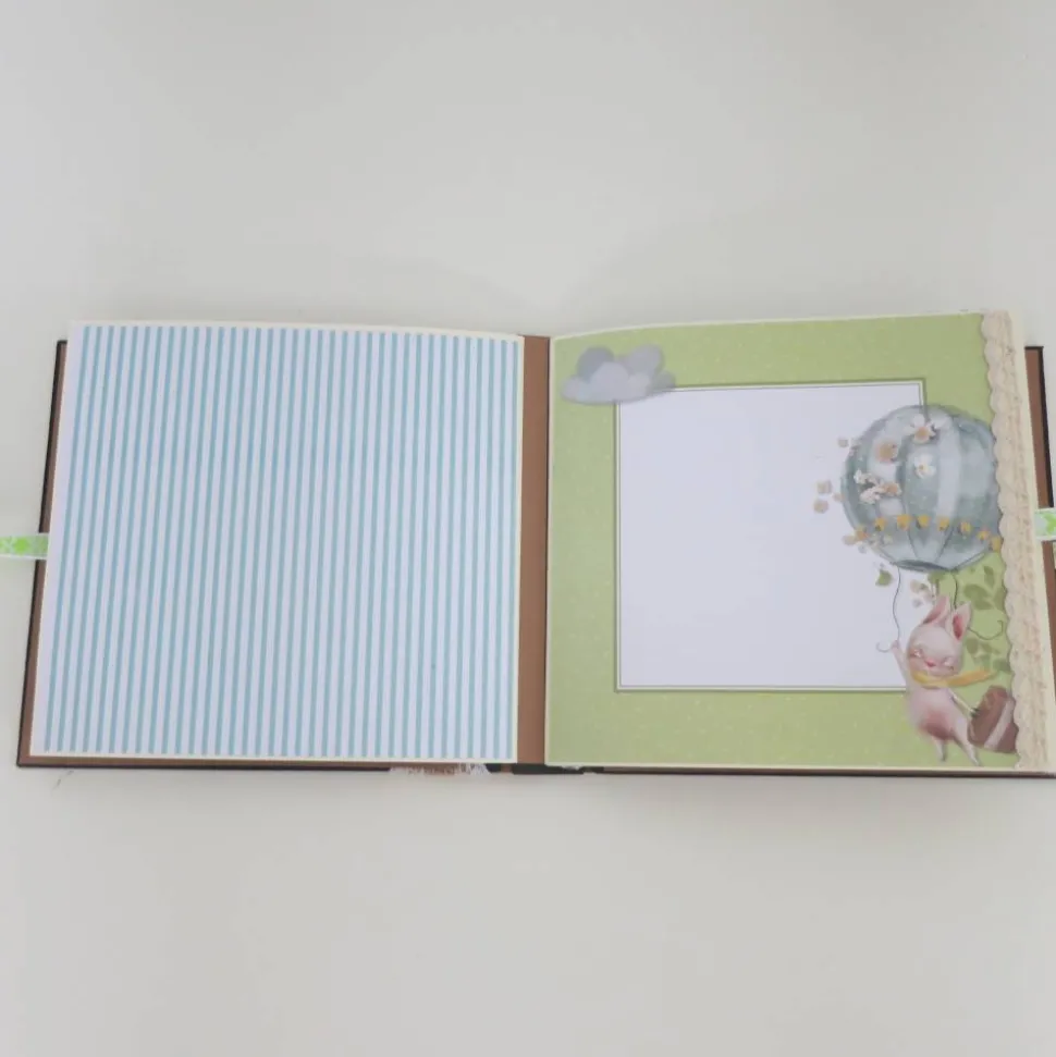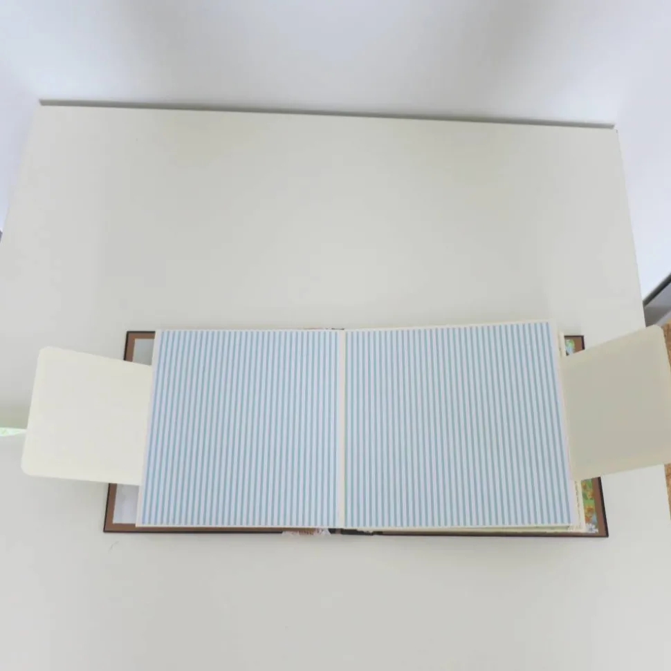 Das Album bietet Platz für 20 Fotos in verschiedenen Größen. Das Album wird mit einem Schleifenband verschlossen.