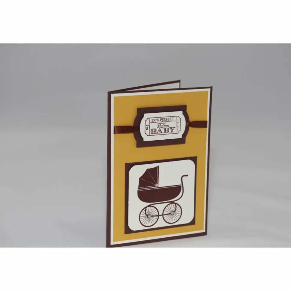 Die Grundkarte ist dunkelbraun, darauf befindet sich ein Aufleger in currygelb, der mit einer weißen Mattung versehen wurde. Zentraler Blickpunkt ist das Kinderwagenmotiv das in braun auf weiß gestempelt wurde und dann passend in braun gemattet wurde. Der Kinderwagen wurde zusätzlich mit kleinen Halbperlen verziert. Darüber ist ein kleines Schildchen zu sehen, „100% perfekt kleines Baby“, das ebenfalls in braun gemattet wurde. Zusätzlich zieht sich an den Seiten ein braunes Satinband um das Schildchen.