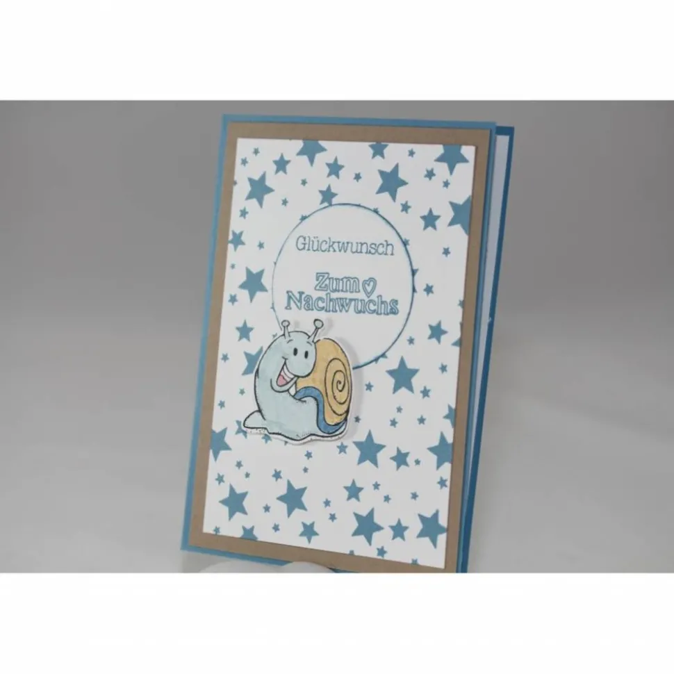 Verwendet wurden die Farben Flüsterweiß, Ozeanblau und Savanne. Der Hintergrund wurde mit vielen Sternen bestempelt. Der Kreis mit dem Glückwunsch wurde ausgestanzt und an den Rändern mit ozeanblauer Farbe gewischt. Die Schnecke wurde gestempelt, handcoloriert und ausgeschnitten und dann mit Abstandklebepads auf die Karte geklebt.