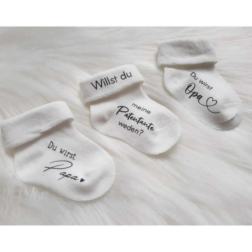 Die Deko-Socke ist weiß mit hochwertigem schwarzen Aufdruck und wird ohne weitere Deko geliefert. Die Baby-Socke eignet sich auch ideal, um eine wichtige Frage wie „Willst du mein Patenonkel werden?“ zu stellen und ist das perfekte Geschenk für werdende Eltern, Großeltern, Tanten, Onkel oder Paten.