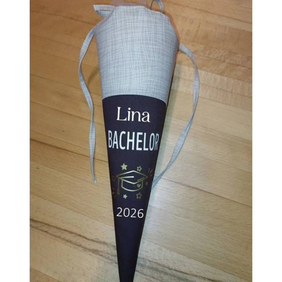 Angeboten wird eine kleine Schultüte mit einem passenden Spruch zum Abschluss des Studiums (Hier Bachelor)