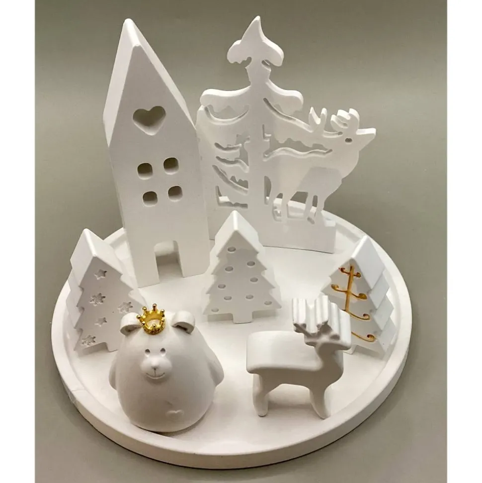Dieses liebevoll handgefertigte Dekoset besteht aus acht frei beweglichen Teilen und lässt deiner Kreativität freien Lauf. Du erhältst einen Teller mit einem Durchmesser von 16 cm, einen Hirsch mit Bäumen (8 x 11 cm), ein Haus (4 x 12 cm), ein Bärchen (5 cm hoch), einen kleinen Hirsch (3,5 x 5,5 cm) sowie drei Tannenbäume (jeweils 3 x 5 cm). Alle Elemente kannst du jederzeit umdekorieren und nach deinen Vorstellungen arrangieren.