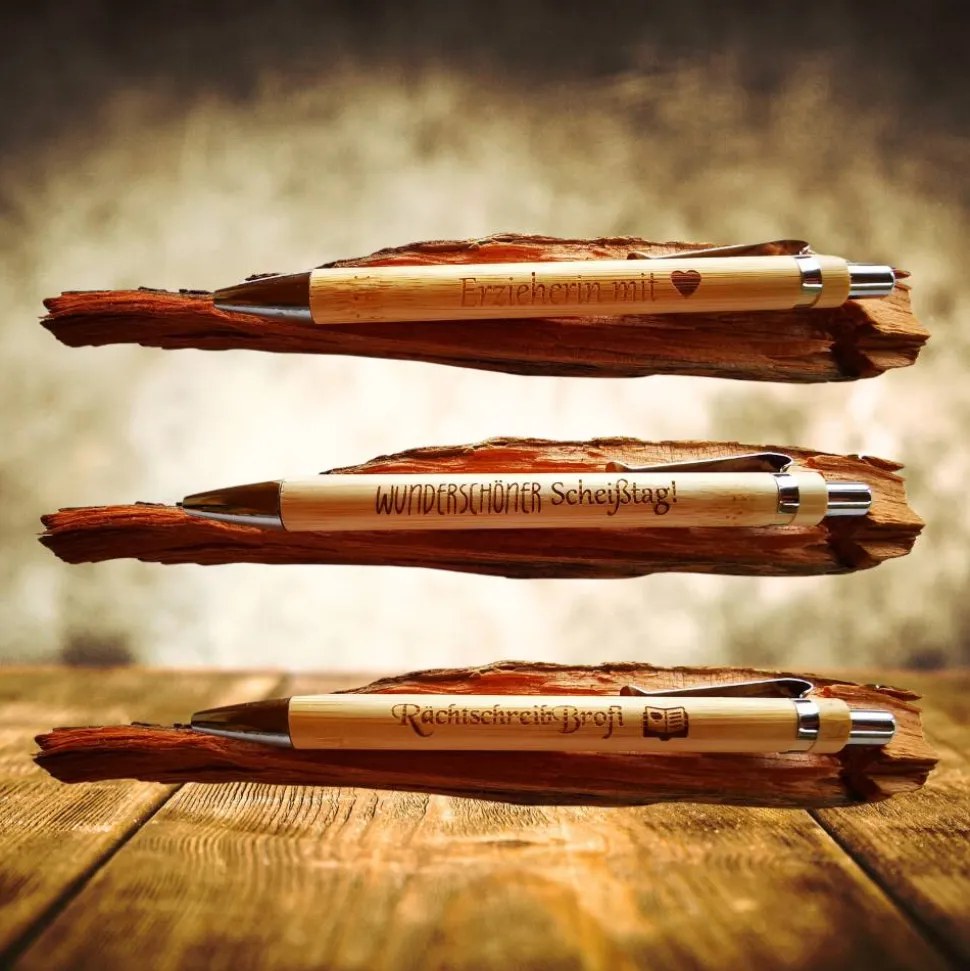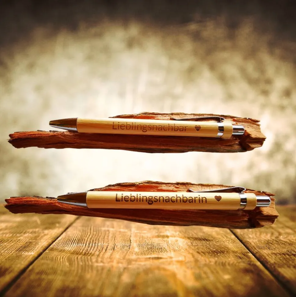 Entdecke den Bambus Kugelschreiber mit Lasergravur – das perfekte Accessoire für individuelle Geschenke und Werbeanlässe. Jeder Kugelschreiber wird aus hochwertigem Bambus gefertigt und mit modernster Lasertechnologie graviert, sodass du deinen Wunschtext, Namen, lustigen Spruch oder sogar deinen Firmennamen personalisieren kannst.