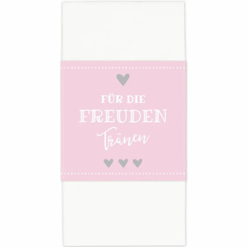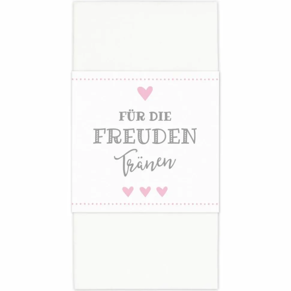 Einfach das Taschentuch in die Mitte der Banderole legen, die Banderole umfalten und mit einem der beiliegenden Klebepunkte verschließen. Fertig!