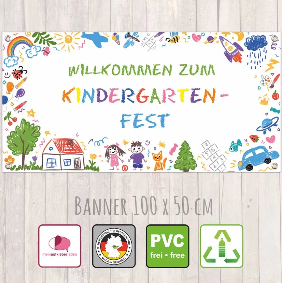 Banner mit vielen bunten Kinderzeichnungen: Regenbogen, Auto, Haus, Kinder, Rakete, Blumen, Tiere u.v.m. Personalisiere das Banner mit deinem Wunschtext. Perfekt für Veranstaltungen im Kindergarten, Kindertag oder andere Feierlichkeiten für Kinder