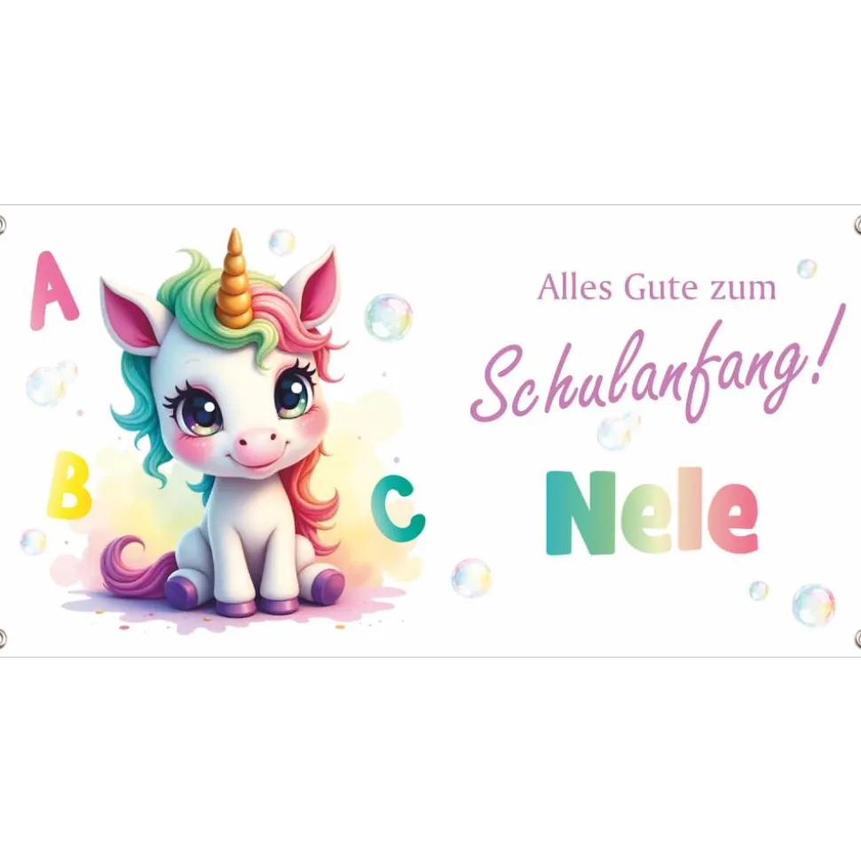 Ein liebevoll gestaltetes, weißes Einhorn mit türkis, grüner, rosa Mähne, großen, leuchtenden Augen, ABC Buchstaben und Seifenblasen im Aquarell-Look. Personalisiere den Banner mit dem Namen deines Kindes und schaffe so eine ganz besondere Erinnerung an diesen wichtigen Tag. Perfekt für die Einschulungsfeier!