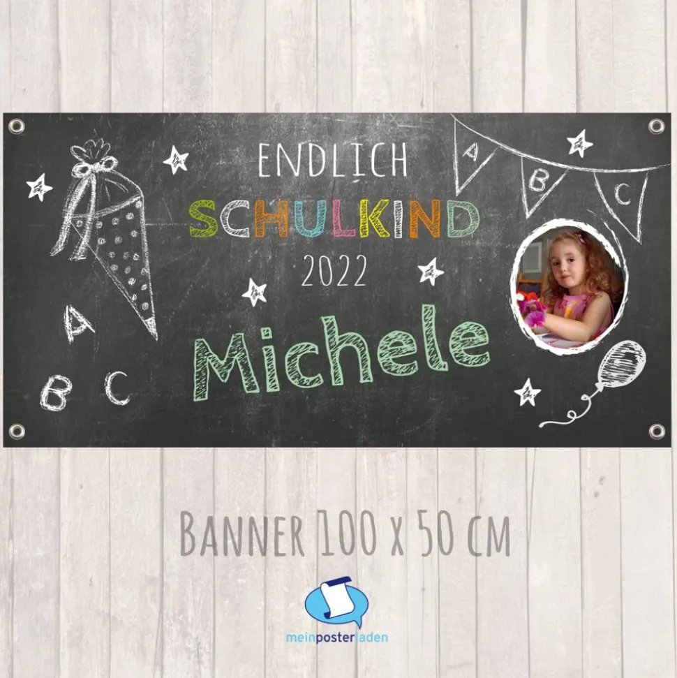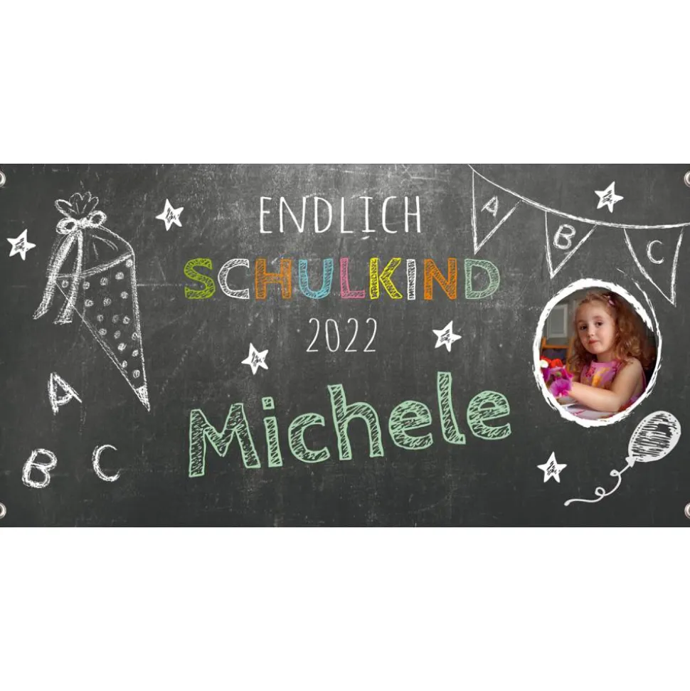 Banner zur Einschulung 100 x 50 cm – mit Foto personalisierbar | Tafeloptik – Endlich Schulkind