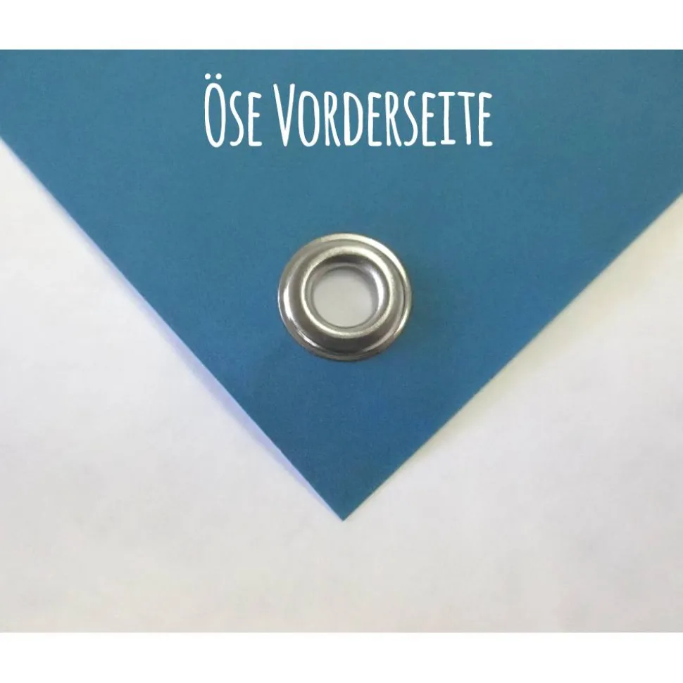 Auf der Rückseite des Banners verwenden wir Ösenverstärker aus den entsprechenden Materialien des Banners. Damit wird ein Ausreißen der Ösen unwahrscheinlich.