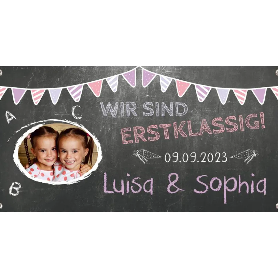 Bedrucktes und personalisierbares Banner zum Schulanfang für Zwillinge (wenn du für mehr Kinder einen Banner möchtest, schreibe mir vor dem Kauf bitte eine Nachricht, dann gestalte ich dir gerne ein passendes Banner)