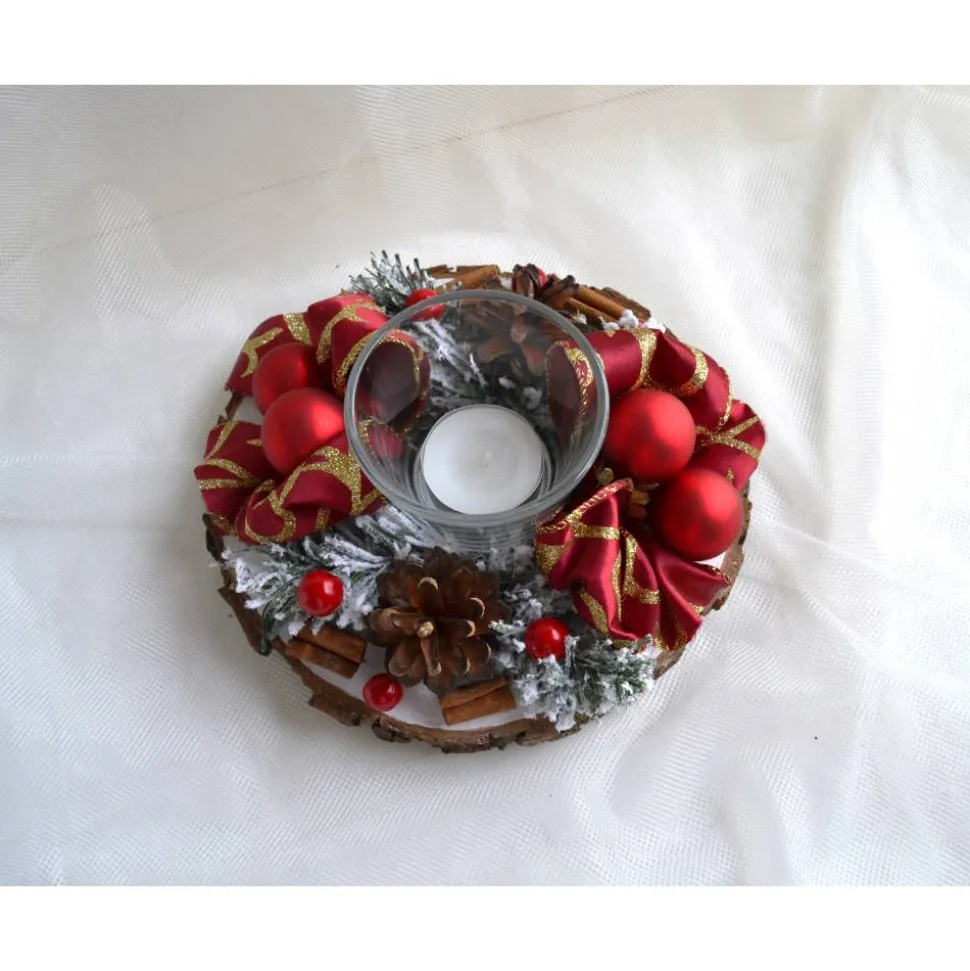 Dieses schöne Weihnachtsgesteck ist eine schöne Dekoration für den Tisch oder das Sideboard. Es ist liebevoll von Hand auf eine Baumscheibe dekoriert. Die Schleife ist in traditioneller Weihnachtsfarbe rot-gold. Es versprüht einen romantischen und weihnachtlichen Charme.