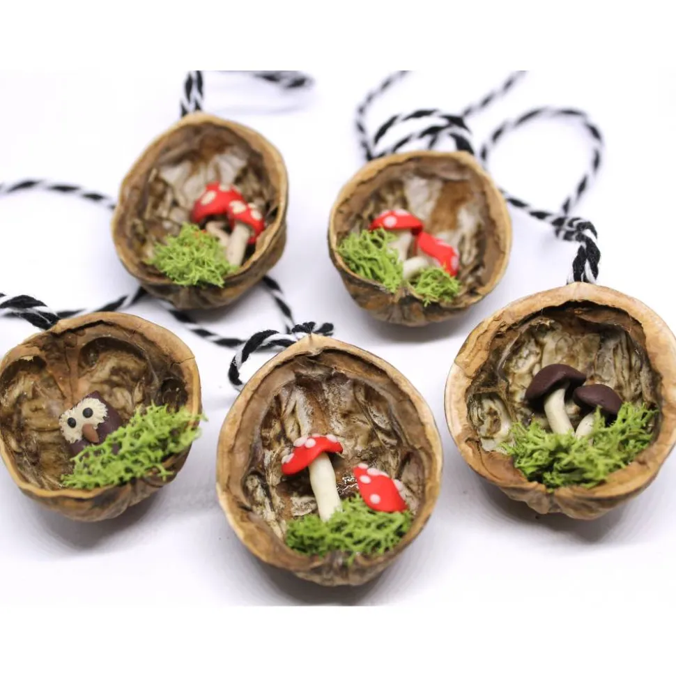 Es handelt sich bei jedem Set um ein Einzelstück, welches mit Liebe von Hand gefertigt wurde. In 5 kleinen, halben Walnüssen verstecken sich Fliegenpilze, Steinpilze und eine kleine Eule. Die winzigen Figuren bestehen aus Polymer Clay und sitzen jeweils auf echtem, grünen Moos. Da jedes Set ein Unikat ist, kann die Farbe der Eule abweichen. Ich liefere sie in braun oder weiß.