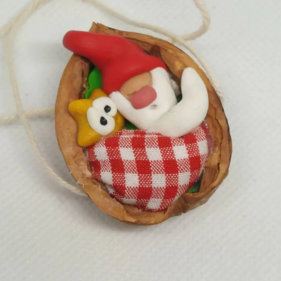 Ein zauberhaftes Unikat für deinen Weihnachtsbaum. Die echten Walnussschale ist ein kleines Schaukelbettchen in der sich ein kleiner Wichtel mit Stern aus Polymer Clay gemütlich unter ein handgenähtes Kissen kuschelt. Er trägt eine rote Zipfelmütze und schlummert mit seinem goldigen Stern.