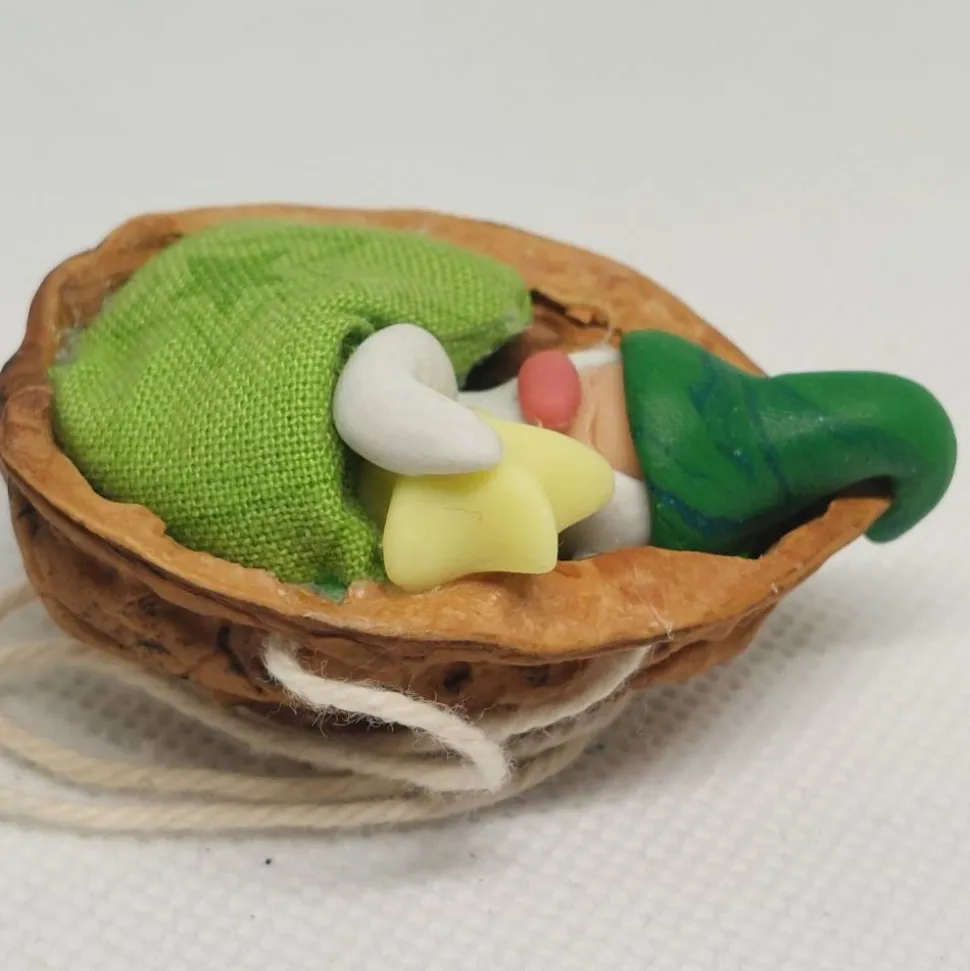 Ein zauberhaftes Unikat für deinen Weihnachtsbaum. Die echten Walnussschale ist ein kleines Schaukelbettchen in der sich ein kleiner Wichtel mit Stern aus Polymer Clay gemütlich unter ein handgenähtes Kissen kuschelt. Er trägt eine grün mamorierte Zipfelmütze und schlummert mit einem kleinen nachtleuchtenden Stern.