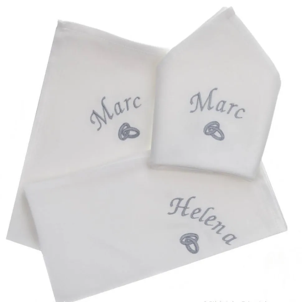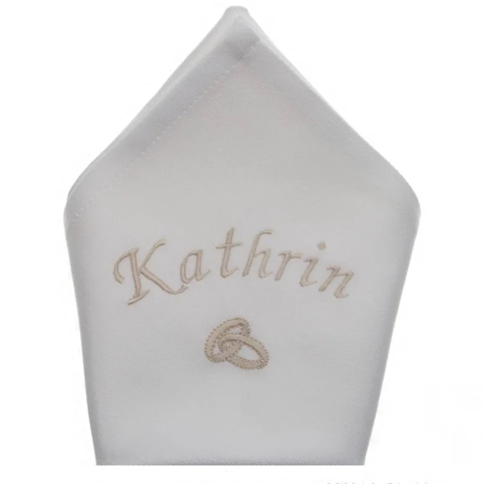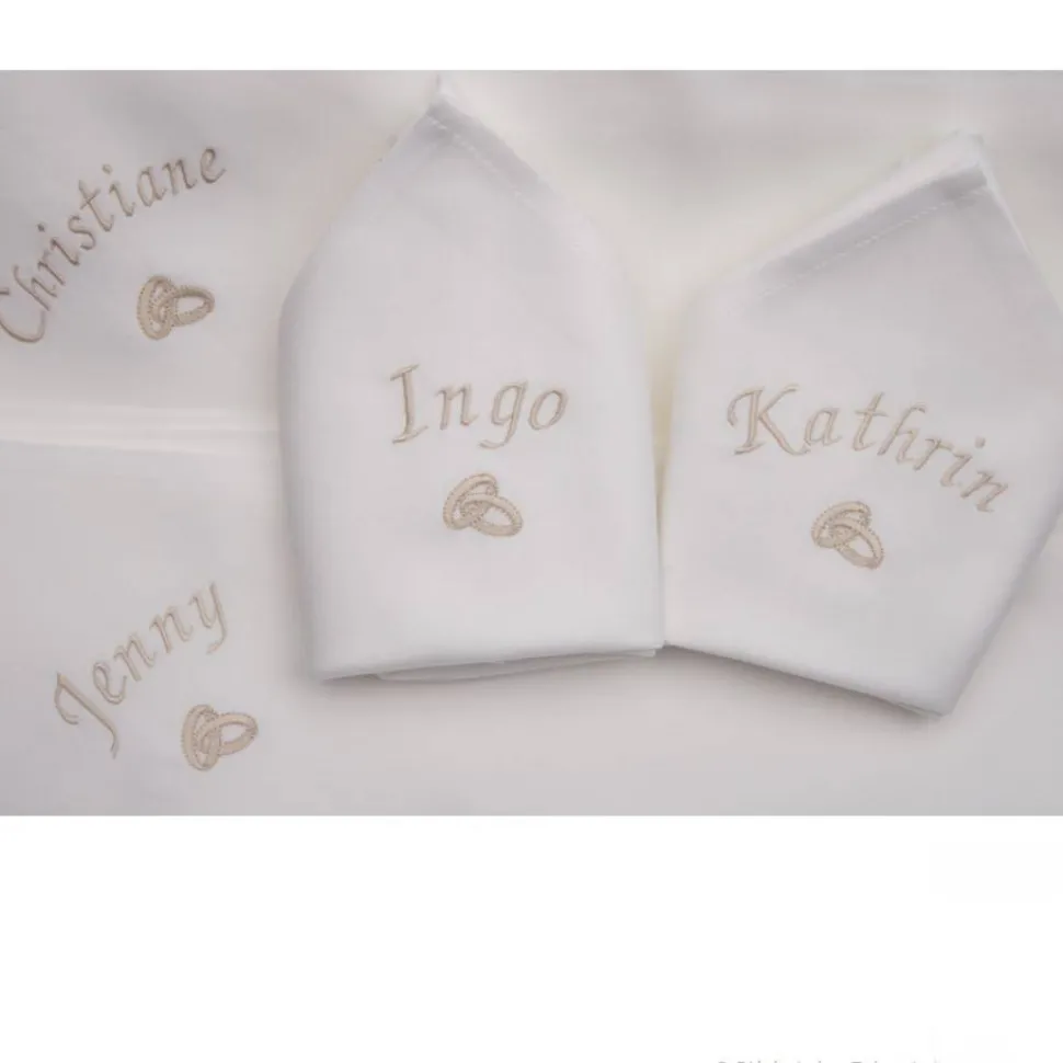 Sie wird mit dem Namen des Gastes bzw.des Brautpaares leicht gebogen bestickt und Ehering.