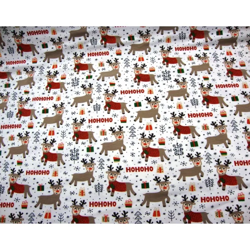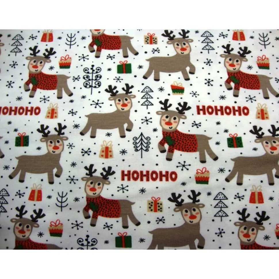 Entdecke den hochwertigen Baumwolljersey HOHOHO Rentiere weiß! Dieser weihnachtliche Jersey-Stoff ist die perfekte Wahl für festliche Nähprojekte. Das zauberhafte Rentier-Motiv macht den Stoff zum Highlight für Weihnachten. Die Motivgröße der Rentiere beträgt 4,5cm lang und 5cm hoch.