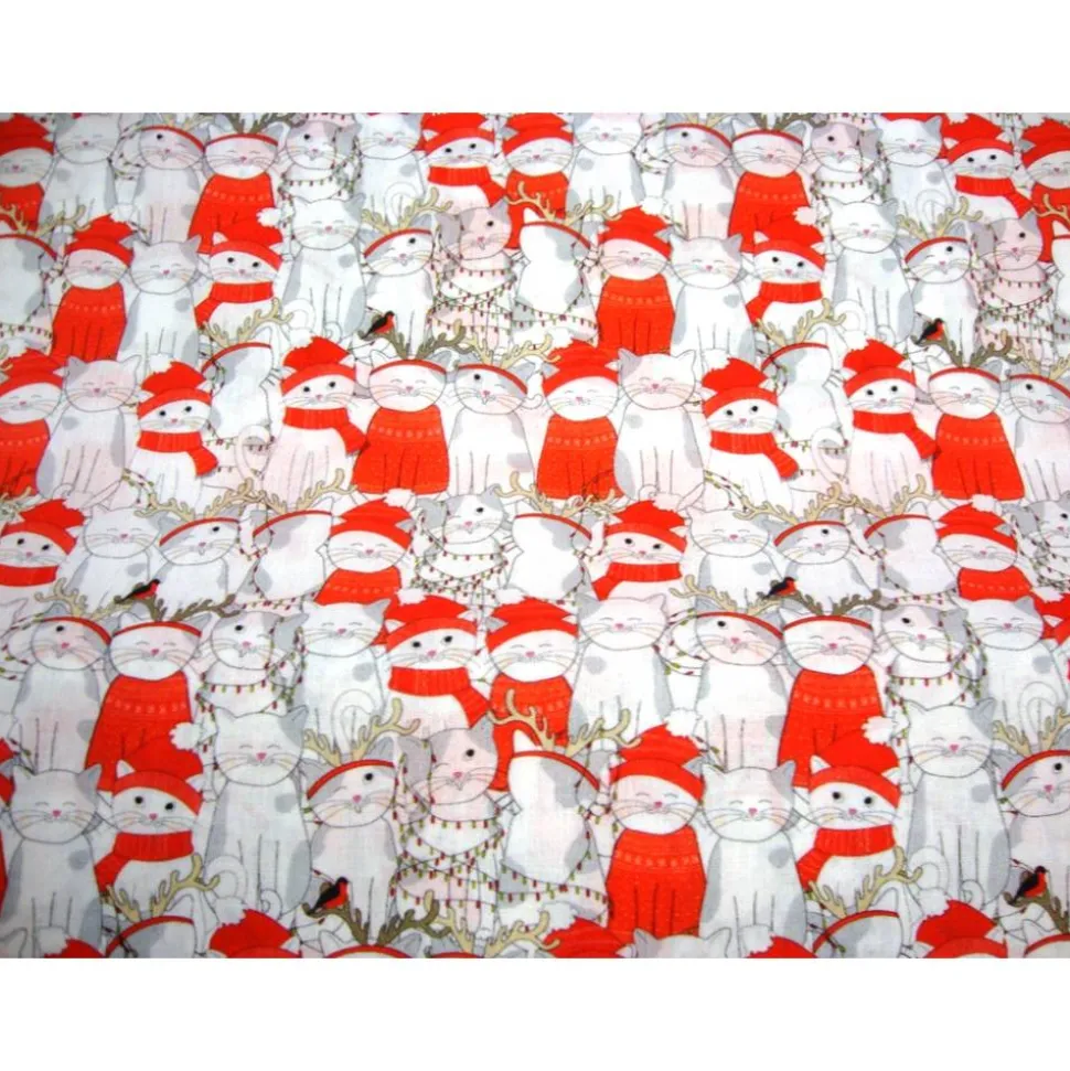 Entdecke festlichen Baumwollstoff für Weihnachten! Dieser liebevoll gestaltete Baumwollstoff zeigt niedliche weiße Kätzchen mit roten Weihnachtsmützen und roten Schals auf weißem Grund – ein echtes Highlight für alle Katzenfans.