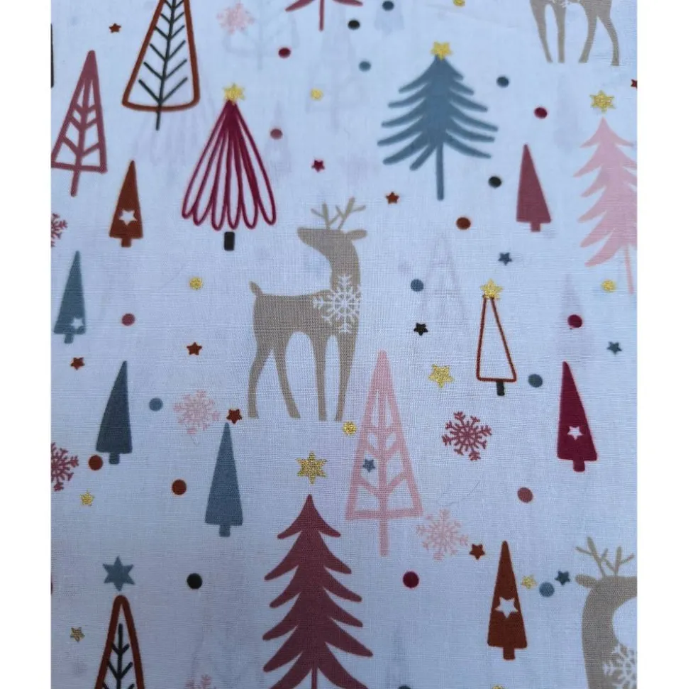 Wunderschöner Baumwollstoff mit Weihnachtsmotiven wie Tannenbäume,Rentier, Sterne in natur mit altrosa, petrol, beige, gold bedruckt.