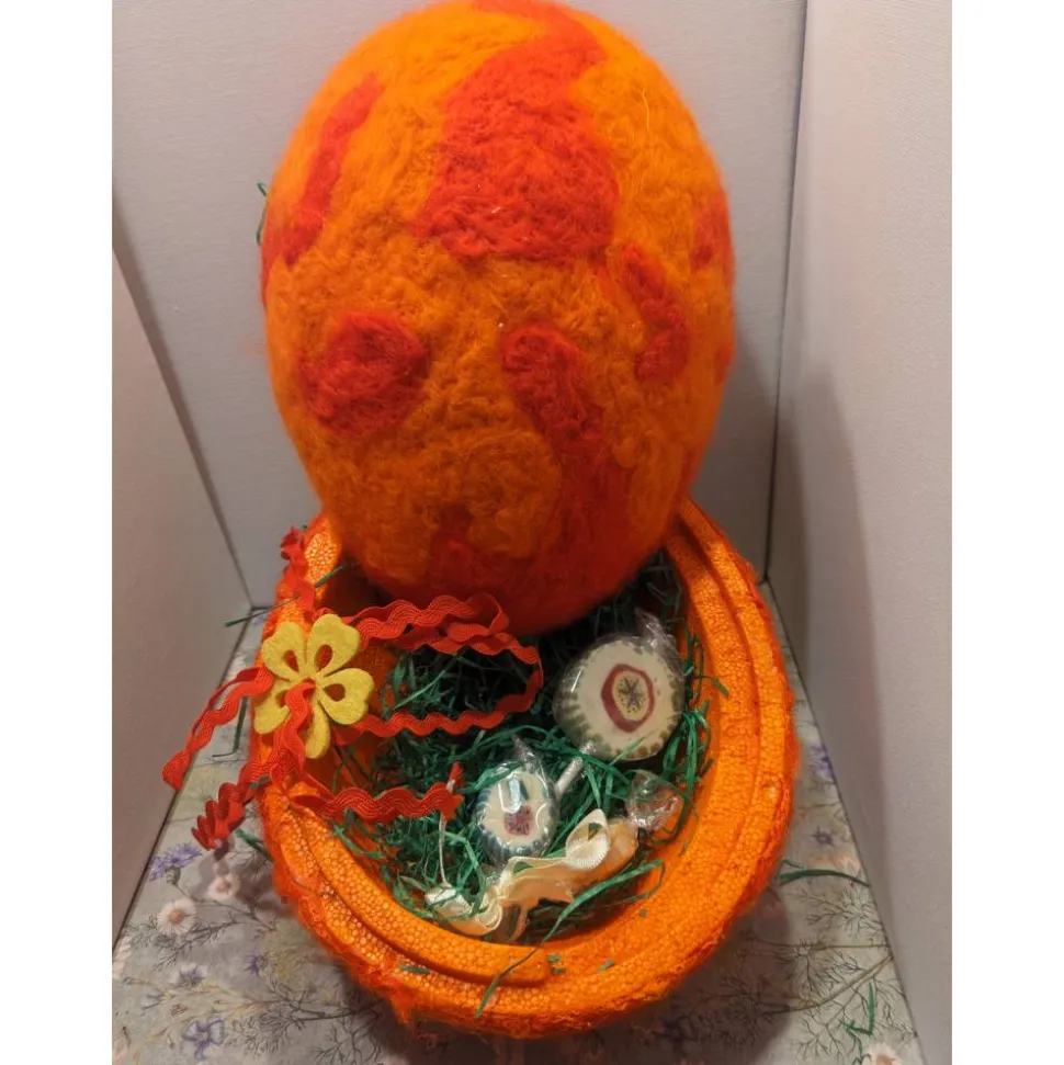 Dabei habe ich orangene – und rotfarbene Filzwolle mit einer Filznadel in das Styroporei eingearbeitet. Ostermotive und Zackenlitze vervollständigen die Verzierung.