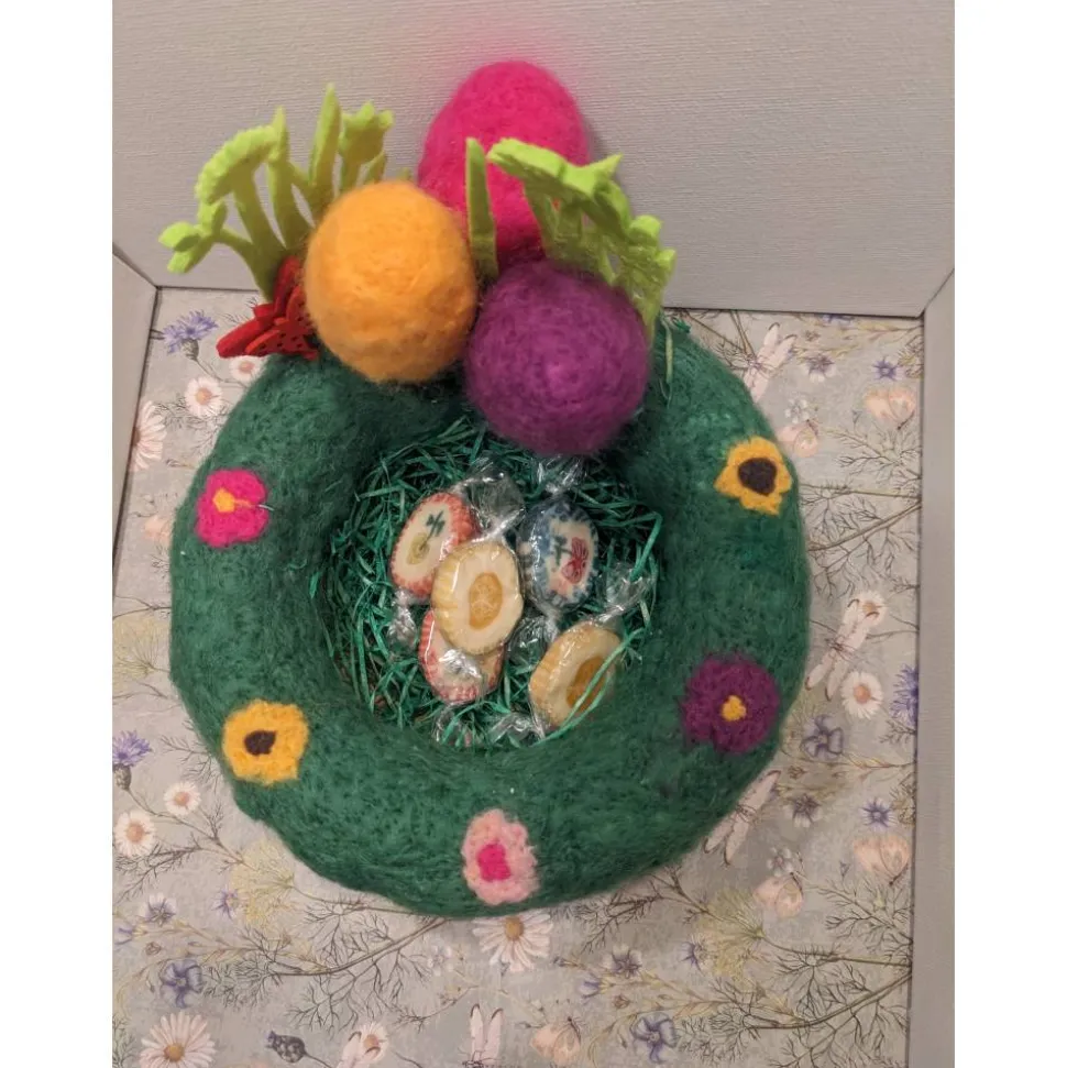 Blickfang von diesem schönen Osternest sind die buntgefilzten Styroporeier. Weitere Verzierungen sind Filzblumen und Ostermotive. Im Nest befindet sich gefärbte Holzwolle.