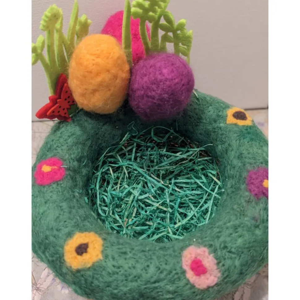 Dieses schöne Osternest entstand aus einem Körbchen, einem Styroporring und mit Hilfe der Nadelfilztechnik. Dabei wird mit einer Filznadel die Filzwolle in das Styropor eingearbeitet.
