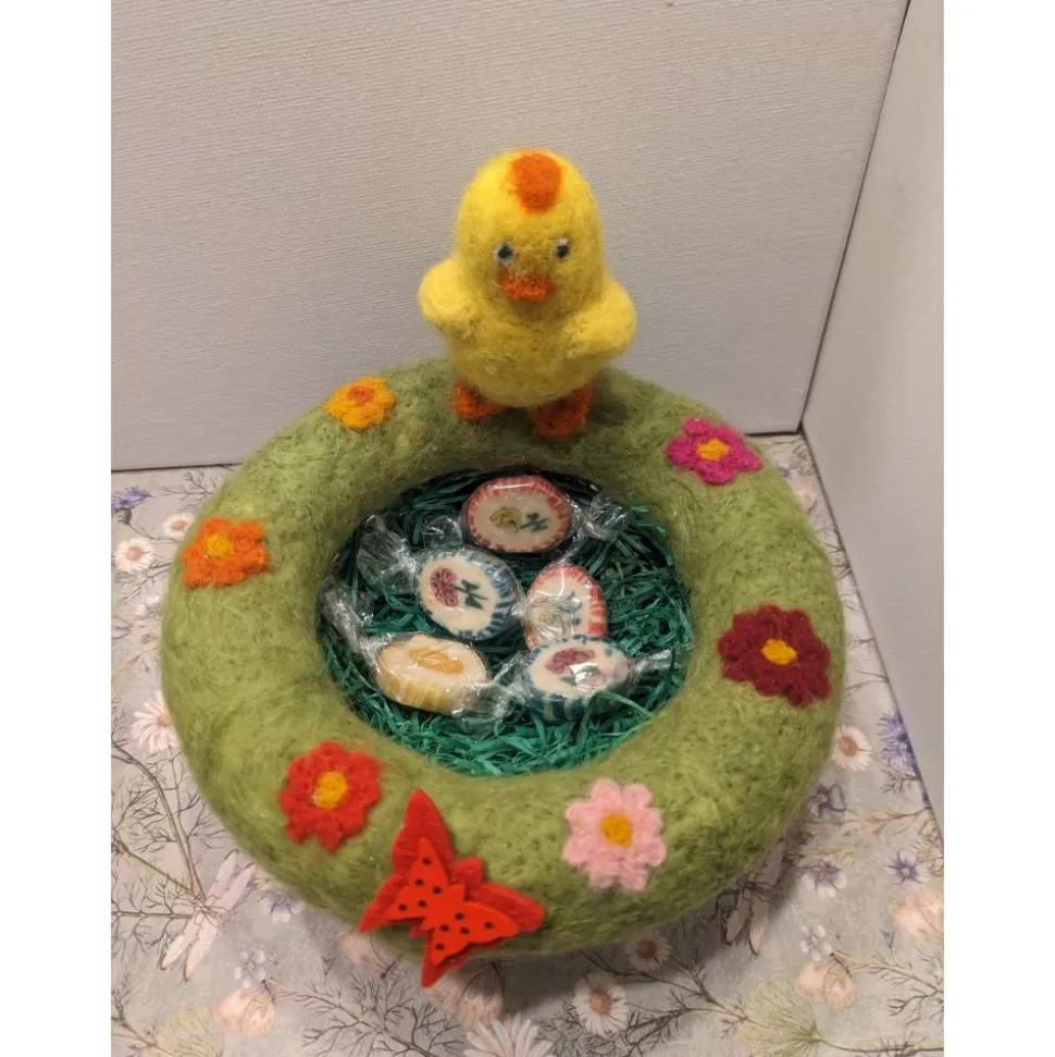 Der Durchmesser des Körbchens beträgt ca.10 cm, das Filzküken ist ca.5 cm groß.