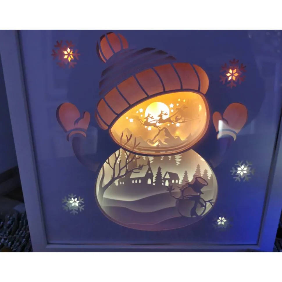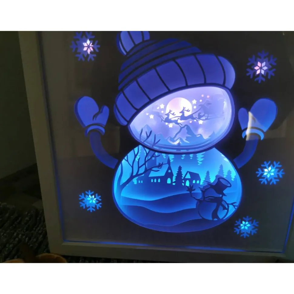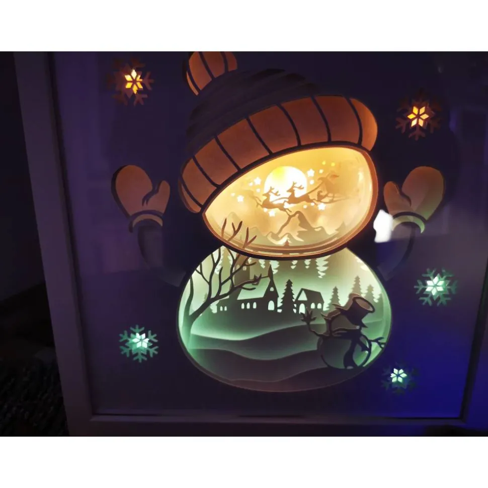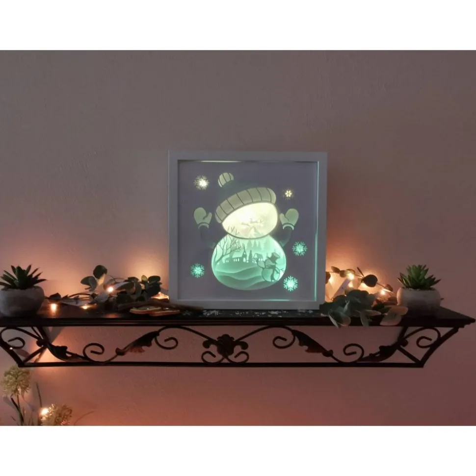 Das Motiv Schneemann wurde aus mehreren Lagen stabilen Cardstock zusammengesetzt, die Led Beleuchtung wahlweise Farbwechsel oder einzelne Farben runden das Bild perfekt ab. Sie können zwischen 12 Farben wählen oder 4 Farbprogramme indem die Farben gemixt werden, auch die Helligkeit ist regulierbar. Das Licht lässt sich einfach per Fernbedienung An und Ausschalten. Der Led Lichterstripe wird per Strom betrieben.