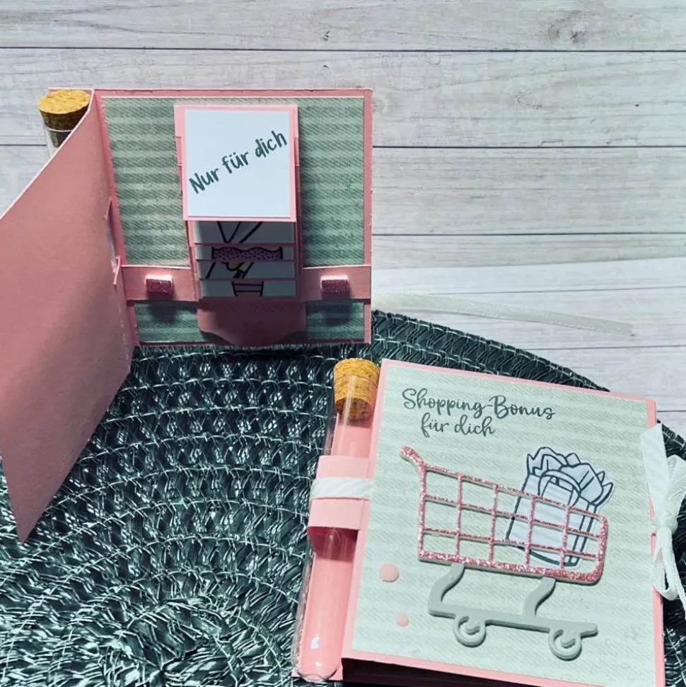 Eine Karte, in der ein Reagenzglas mit verarbeitet ist, wo der Geldschein seinen Platz finden kann. In der Innenseite der Karte ist ein Wasserfall-Mechanismus mit eingebaut, der für Spaß und Spannung sorgt.
