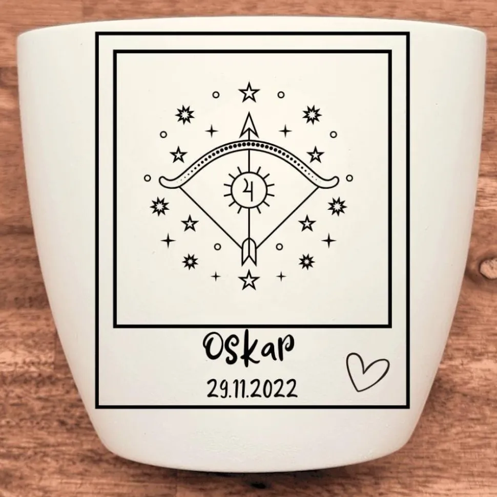 Verschenke zur Geburt einen personalisierten Blumentopf mit einem liebevoll gestalteten Motiv, das das Sternzeichen Schütze hervorhebt. Dieses besondere Geschenk wächst mit der Familie heran und symbolisiert Lebensfreude, Abenteuer und eine tiefe Verbindung zur Natur. Es schafft eine bleibende Erinnerung an die Geburt und unterstreicht die besonderen Eigenschaften des Schützen: Optimismus, Freiheitsliebe und ein starker Drang nach Wissen. Das Sternzeichen Schütze steht für alle, die zwischen dem 22. November und dem 21. Dezember geboren sind.