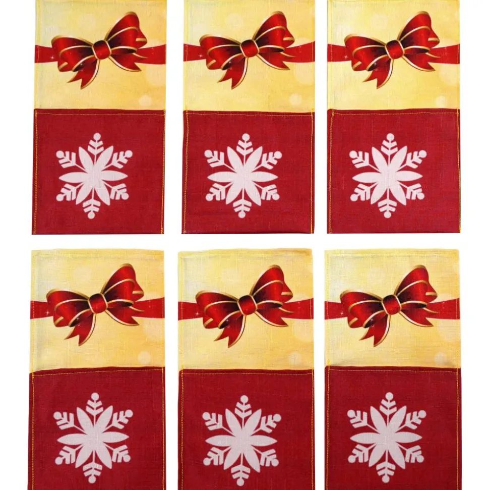 Der Tischläufer kommt in kräftigem Rot mit dezenten Schneeflocken, während die Bestecktaschen in Rot und Gelb mit einer hübschen Schleife und Schneeflocke glänzen. So entsteht eine stimmungsvolle Tischdeko für die Feiertage, die jeden gedeckten Tisch aufwertet.