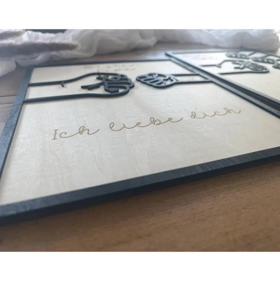 Das Bild besteht aus zwei Teilen, die nach Verarbeitung miteinander verklebt werden. Das Lindensperrholz wird nach ihren wünschen graviert, sowie der obere Teil nach ihren Farbwünschen gestaltet. Die Anzahl der kleinen Fäuste können von 1 bis maximal 4 ausgewählt werden.