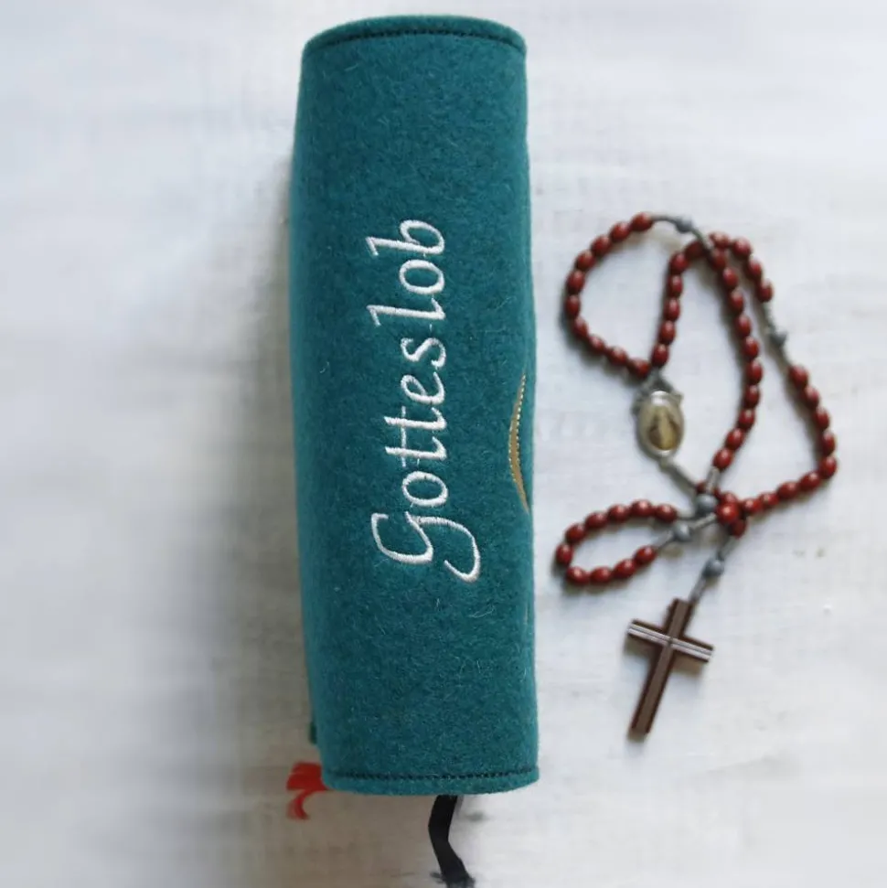 Im Gegensatz zu anderen Produkten verwende ich nicht einfach nur Folie, sondern besticke die Gotteslobhülle mit hochwertigem Stickgarn. Dadurch ist sie nicht nur schön farbenfroh, sondern auch sehr robust und langlebig.