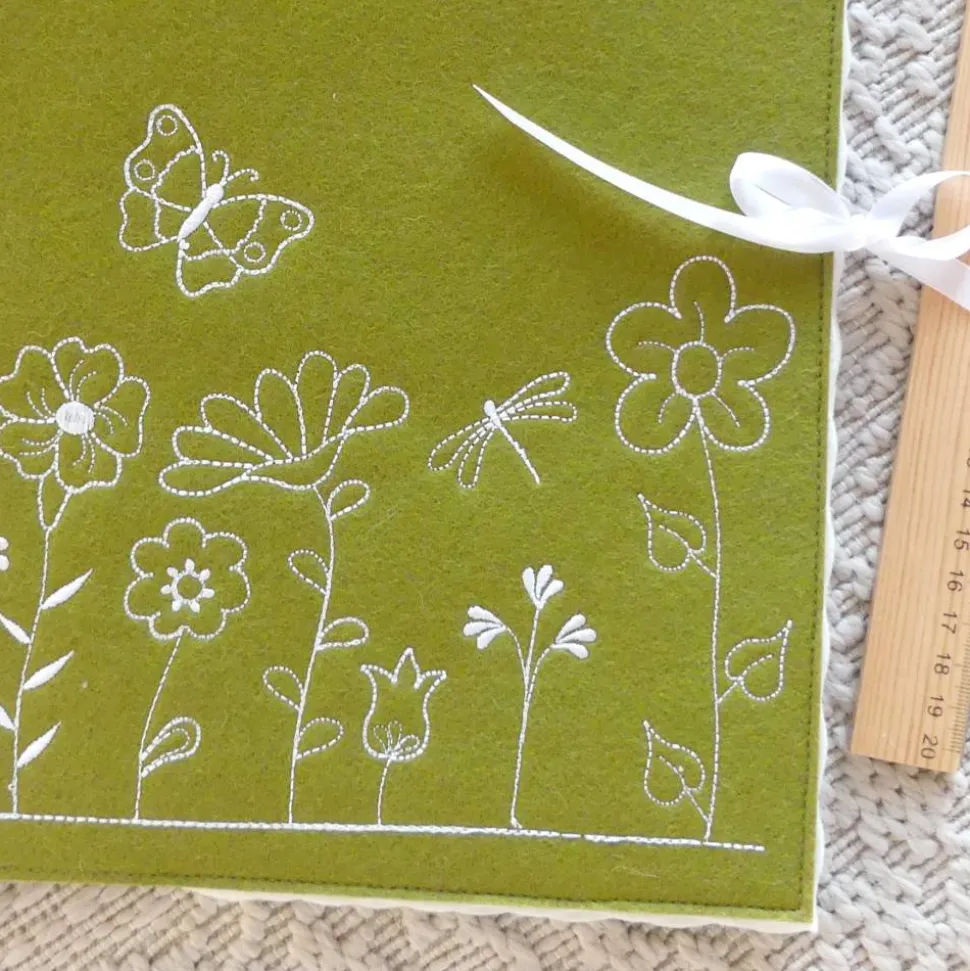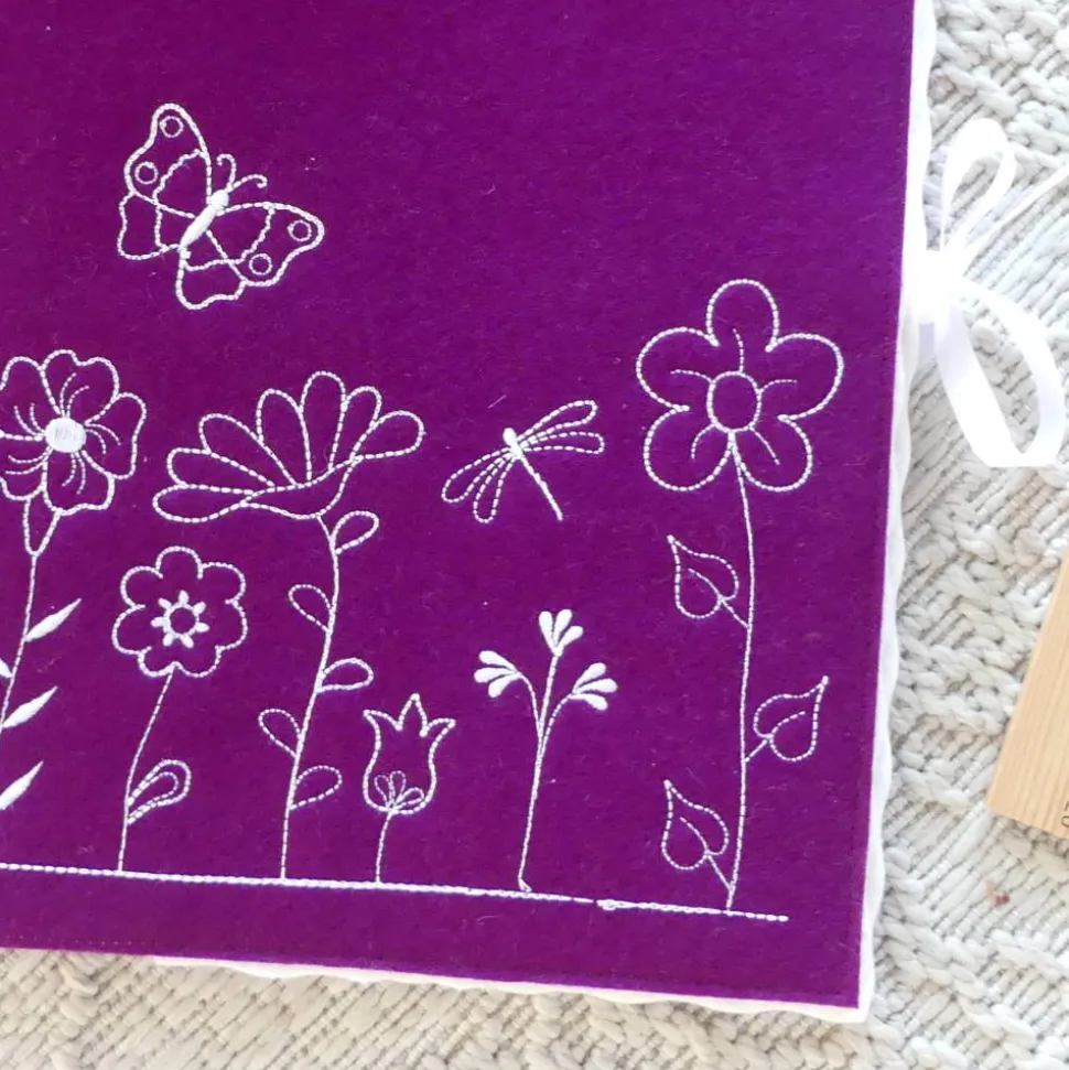 Jede Mappe ist ein Unikat, liebevoll nach deinen Wünschen bestickt und gefertigt. Die aufwendige Stickerei zeigt eine bunte Blumenwiese mit filigranen Blüten und Schmetterlingen.