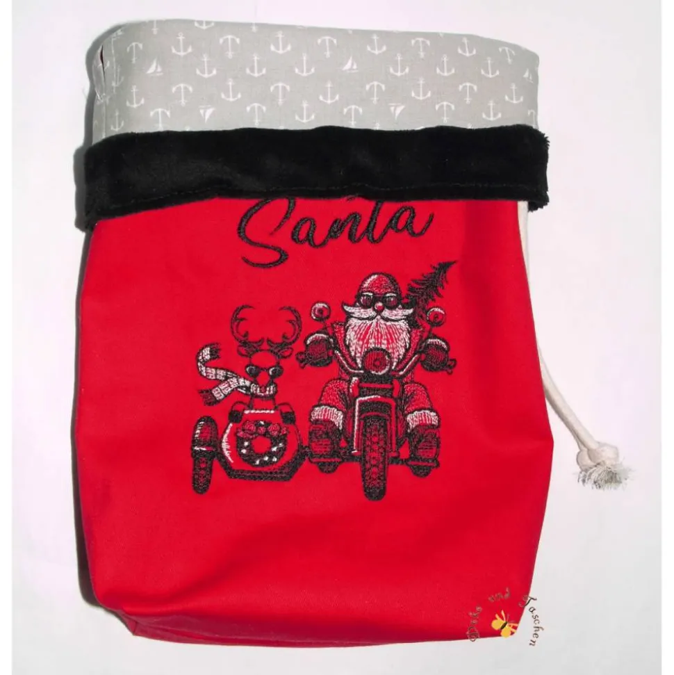 Verschiedene Stickmotive stehen zur Auswahl, siehe Foto. Die Motive werden mit dem Schriftzug „Merry Christmas“ oder „MOIN Santa“ kombiniert. Wünschen Sie einen anderen Text, geben Sie diesen bitte an.