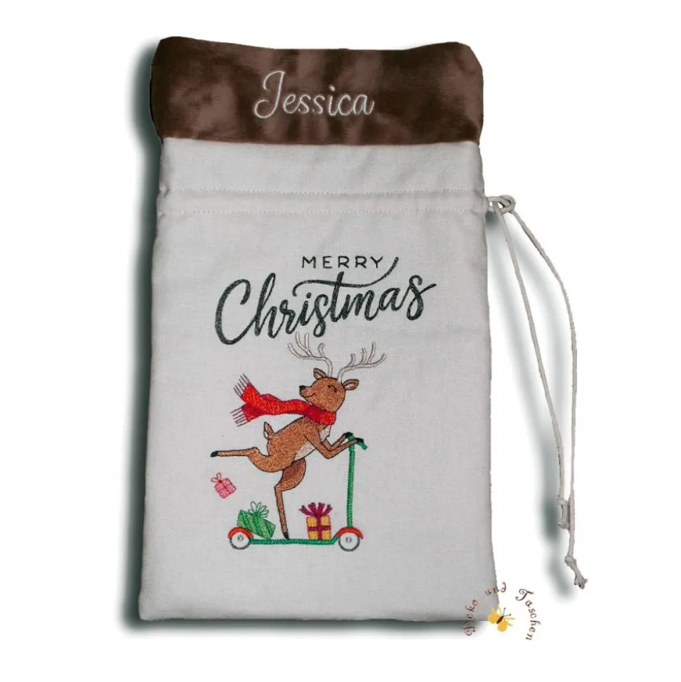 Verschiedene Stickmotive stehen zur Auswahl, siehe Foto. Die Motive werden mit dem Schriftzug „Merry Christmas“ kombiniert. Wünschen Sie einen anderen Text, geben Sie diesen bitte an.