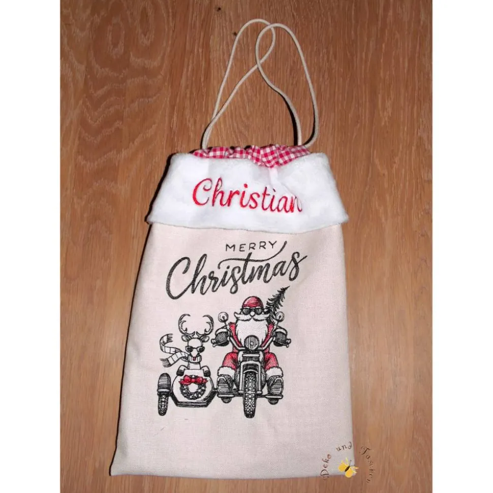 Verschiedene Stickmotive stehen zur Auswahl, siehe Foto. Die Motive werden mit dem Schriftzug „Merry Christmas“ kombiniert. Wünschen Sie einen anderen Text, geben Sie diesen bitte an.