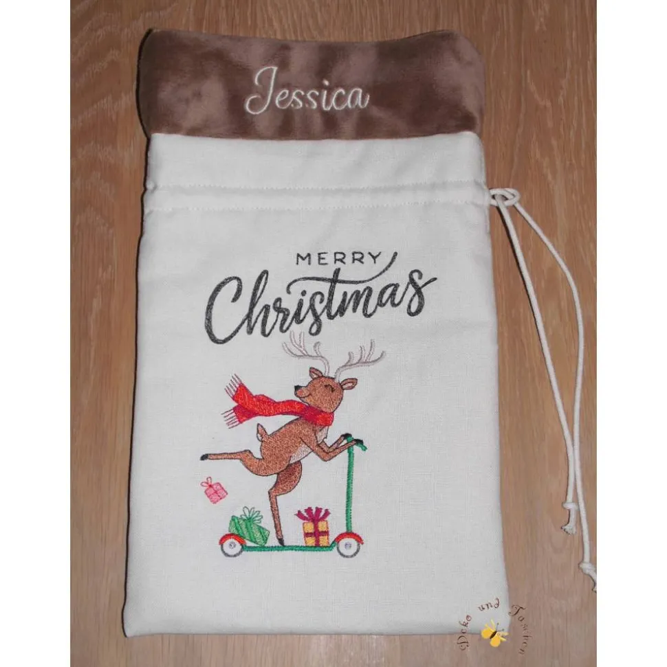 Verschiedene Stickmotive stehen zur Auswahl, siehe Foto. Die Motive werden mit dem Schriftzug „Merry Christmas“ kombiniert. Wünschen Sie einen anderen Text, geben Sie diesen bitte an.