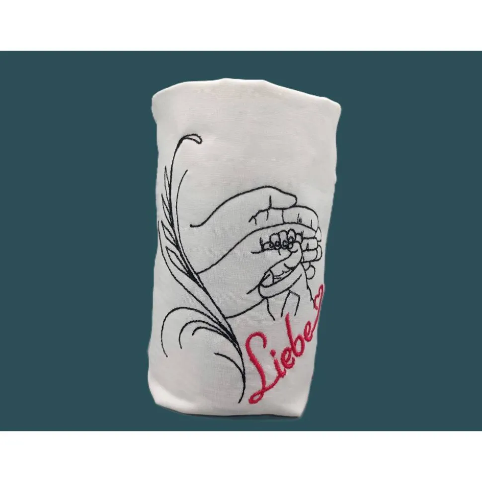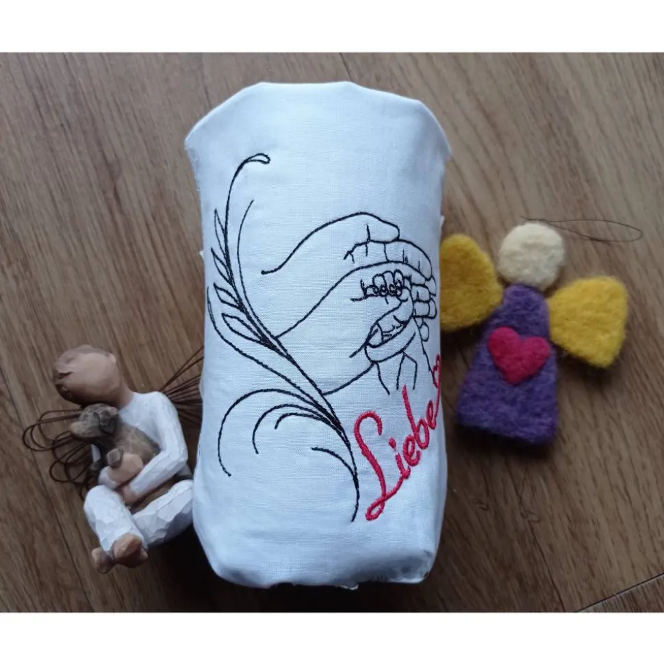 Den Baumwollstoff besticke ich mit meiner Stickmaschine nach individuellen Vorgaben. Gerne kann auch die Stickgarnfarbe gemäß beigefügter Farbkarte angepasst werden.