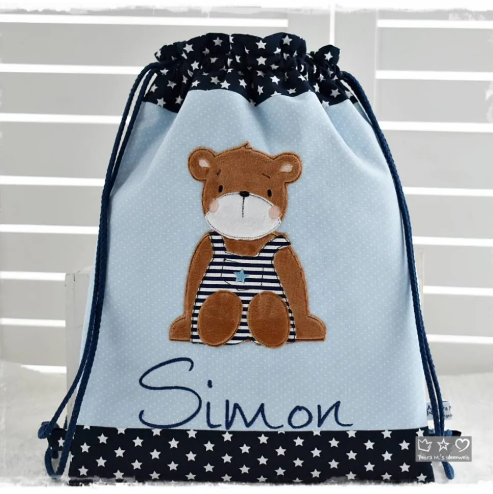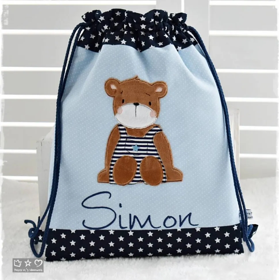 *Liebevoll genähter Rucksack-/Beutel in verschiedenen Größen aus hochwertigen Stoffen unterlegt mit Volumenvlies für mehr Stabilität. Auf der Vorderseite befindet sich eine Doodlestickerei ‚Bär‘ und auf
