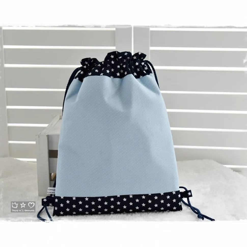 Wunsch kann ein Name aufgestickt werden. Die Innenseite des Rucksacks-/Beutels ist mit einem farblich passenden Baumwollstoff gefüttert. Ebenso befindet sich eine kleine Tasche (z.B. für Taschentuch usw) im Inneren.